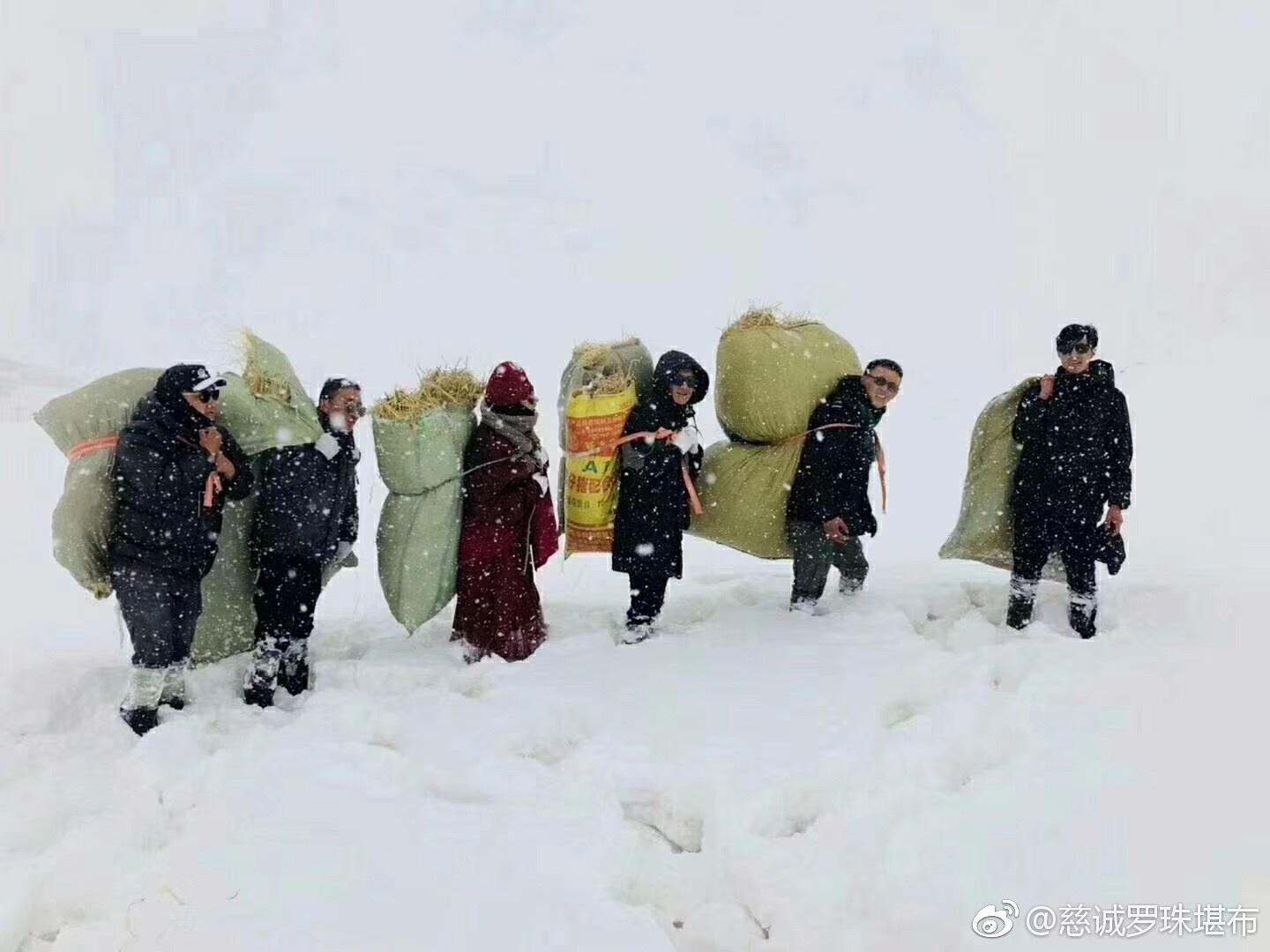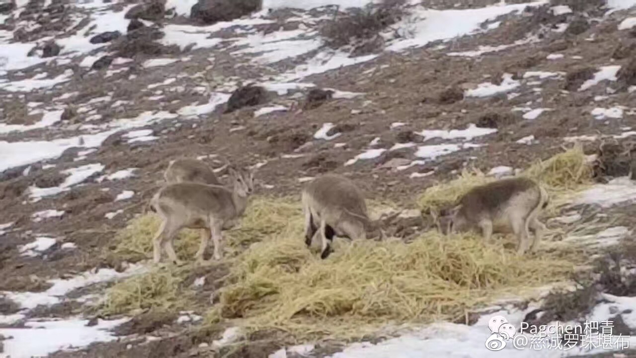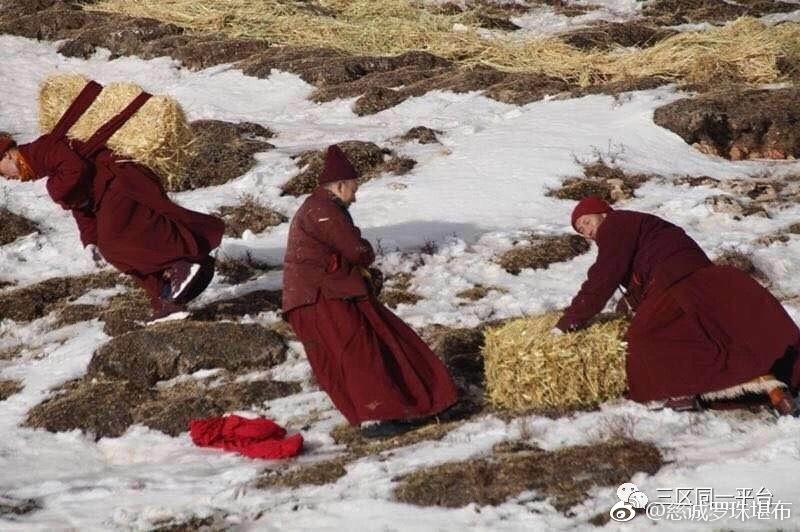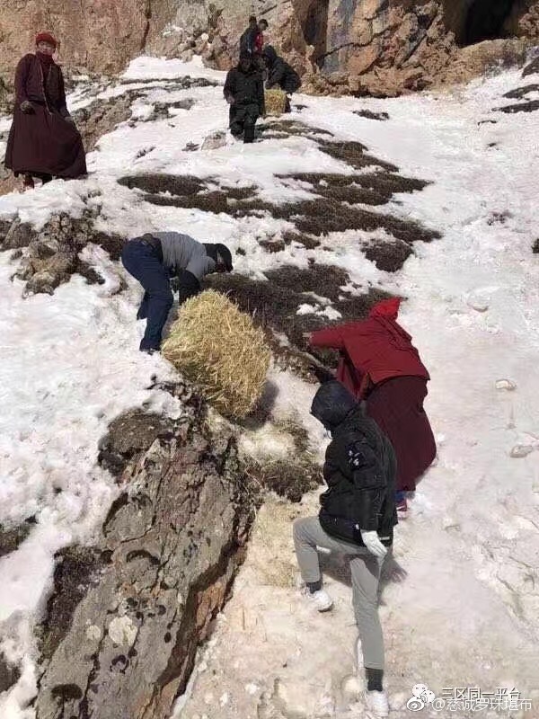 青海玉树猛降大雪,冻死了许多野生动物。当地僧人和群众正在给野生动物送草救灾。