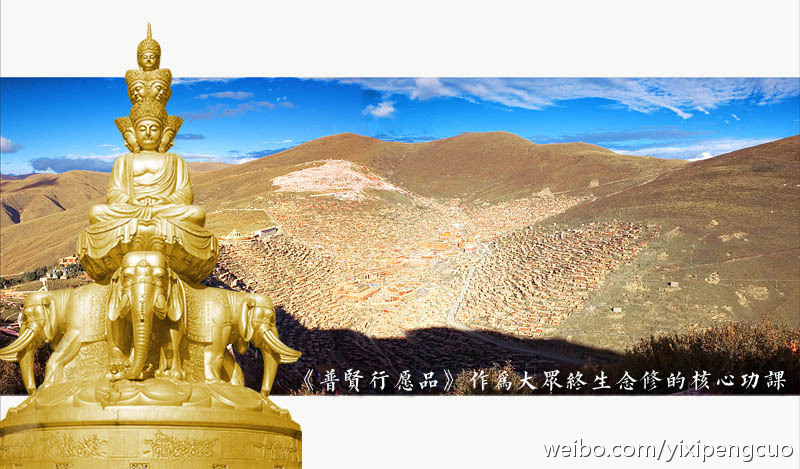 二、比如,1987年圣者法王如意宝带领一万余藏人到汉地山西五台山,大家一同为了往生西方极乐世界念诵了大量《普贤行愿品》。又在法王如意宝住锡的根本道场——喇荣五明佛学院,法王上师把《普贤行愿品》作为大众终生念修的核心课程。