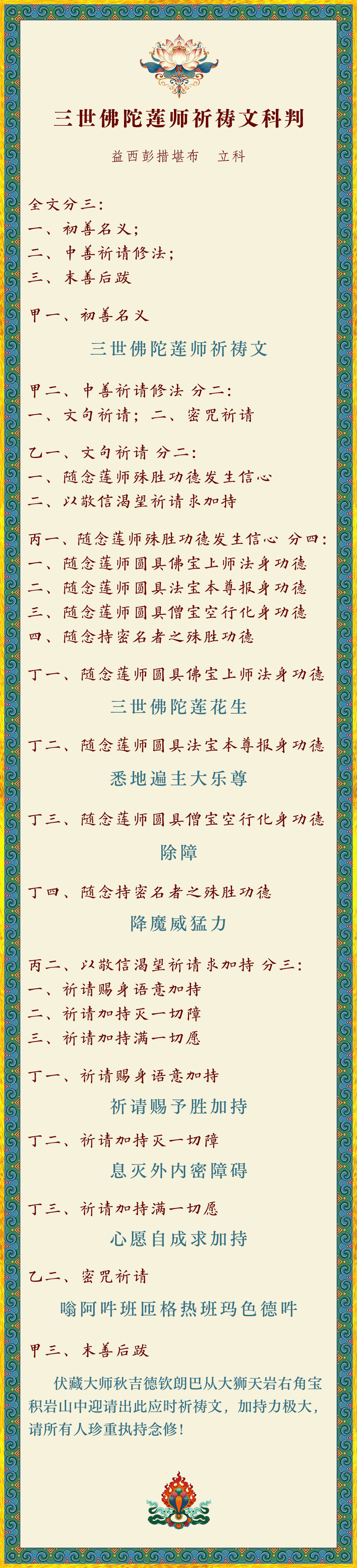 大伏藏师德钦朗巴所取的《三世佛陀莲师祈祷文》,是所有祈祷文的心要,加持力极大,第二世敦珠法王从外内密三层阐释了本伏藏修法的要义。望佛友们精读这一注释,理解法义后常常念修,定能尽除诸障,成满所愿!