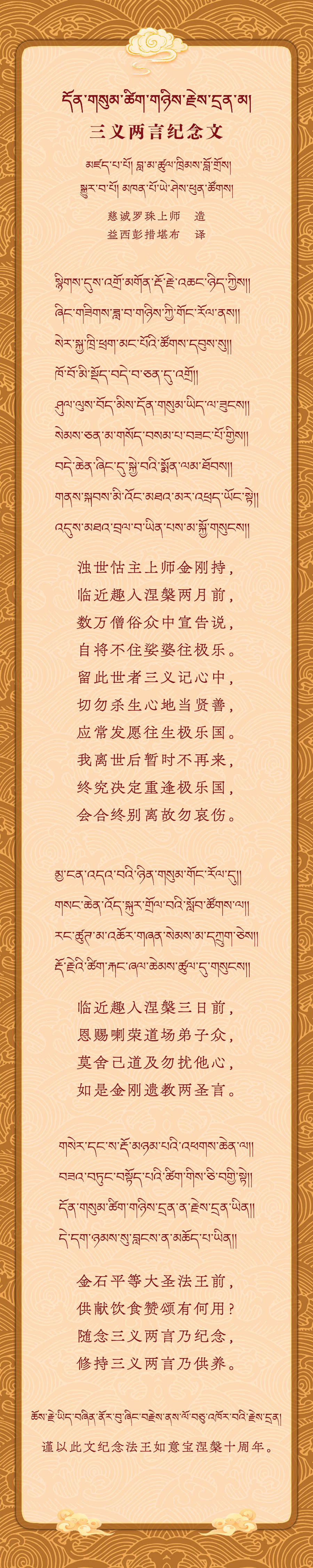 慈诚罗珠上师编集的《三义两言纪念文》摄尽了法王上师的遗教关要,是极为重要的窍诀性教言。值此法王如意宝圆寂二十一周年纪念日,翻译出来分享给道友们,希望大家将此铭记于心,终生依教奉行!