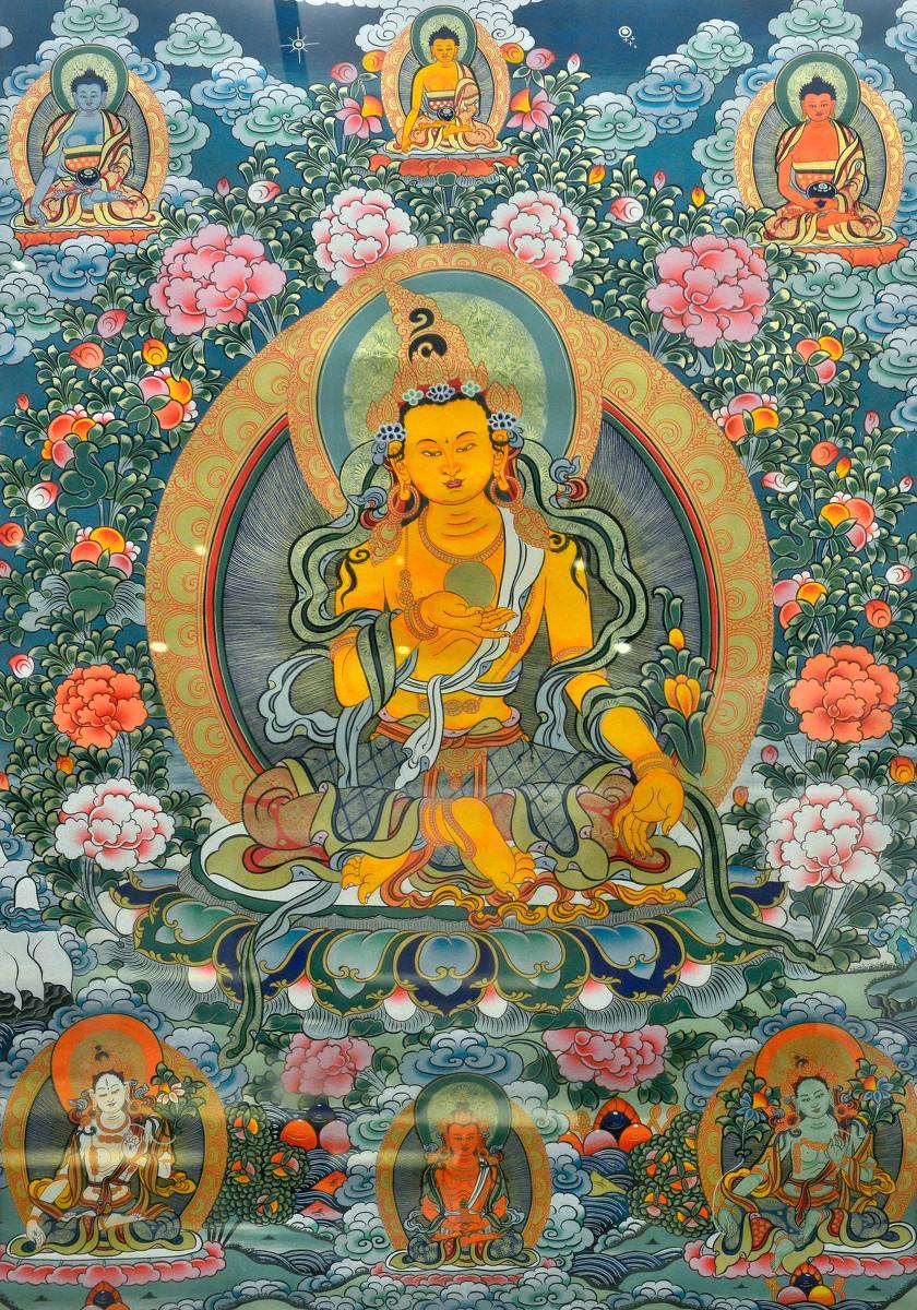 当自身被饥渴所逼,以及缺少衣服、装饰、医药、床铺和各类物质时,一心向地藏菩萨祈求,称其名号、礼敬、供养等,就会发现冥冥中命运已经转变,变得饮食充足,各种物质资具样样不缺。菩萨是法界心,能加被在众生心中,我们只要祈求菩萨,称菩萨名号等,自然染上同分功德,也就是能摄菩萨的功德成自己的功德。就像只要调准频道,自然能接收到电台发射的信息那样,只要有信心、恭敬等内在因素,以及称名等的方便,菩萨的愿力就在我们心中起作用,从这个如意宝里自然出现所求。要像这样了解不可思议的功效。