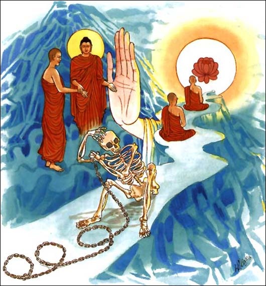 我们在发起诚挚的归依之前最相信自己。俱生的错乱见解,以及受邪师、邪法熏染所出现的现代思想等,成了我们内在的指挥系统,它叫做“胜解”。这股邪胜解强大到了无法拨转的地步,自心始终随着它的指挥一路奔驰,在任何情况下都会发起邪的求取欲,并且以它为动力而出现乱作的精勤,然而最终一无所得。因此,我们应该转变方向,听受彻见安乐之道的大师的教导,为此我们要归依佛。佛明确见到由成办增上生和决定胜两大部类正道所摄的安乐之路,给我们指示了实现人生大义的方法。那么,如何在末法时期短暂的一生中达到目标呢?佛又特别指示了能够一生取办究竟安乐的往生极乐世界的路,这就叫做“大义之路”。