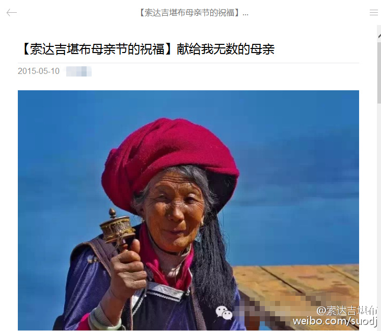 今天,很多人给我发来一条微信,问是不是我写的,名为“索达吉堪布母亲节的祝福:献给我无数的母亲”,落款是局.索达吉。这条微信跟我没有关系,我也不认识此人,近期很多人把他当成我,特此澄清一下。