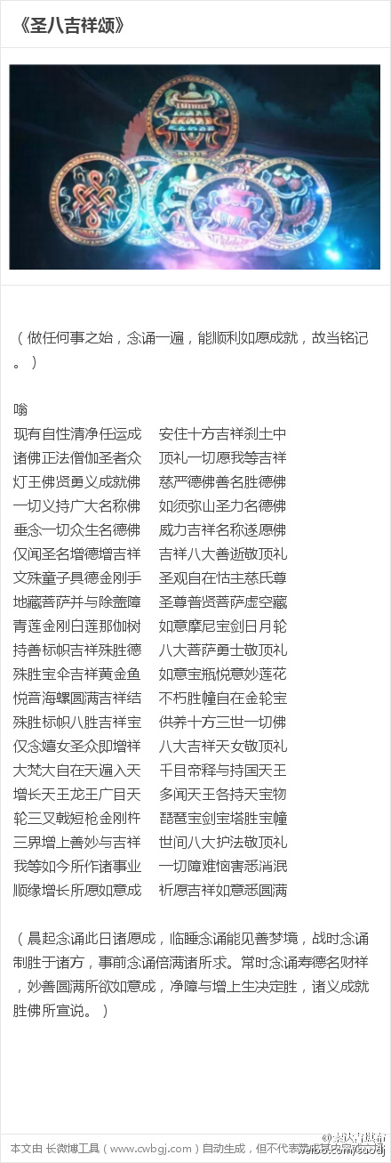 我合掌祈请八吉祥佛、八吉祥菩萨、八吉祥天女、八吉祥护法加持:赐予你健康、安乐、圆满,遣除不顺、违缘、痛苦。一年之计在于始,新年的第一天,若能念诵《圣八吉祥颂》一遍,依靠佛菩萨的加持,可护佑自己和他人在这一年里吉祥增上,快乐连连,身心自在,六时吉祥。《圣八吉祥颂》原声首发 索达吉堪布新年祝福