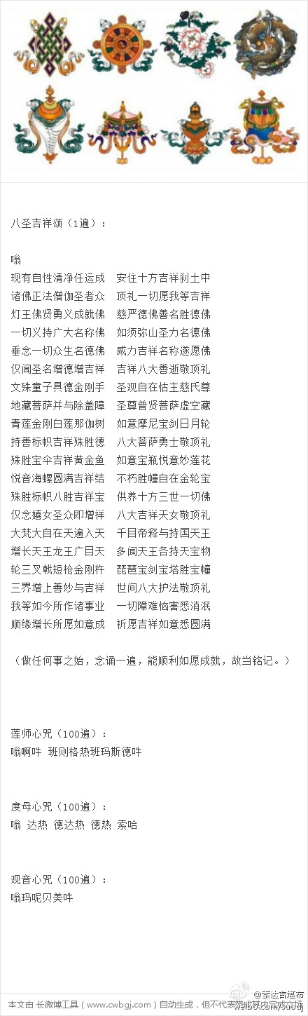 一年之计在于始。新年的第一天,若能念诵八吉祥1遍,莲师心咒、度母心咒、观音心咒各100遍,依靠佛菩萨的加持,可护佑自己和他人在这一年里吉祥圆满、遣除障碍、身心自在、快乐连连。祝福大家元旦吉祥!