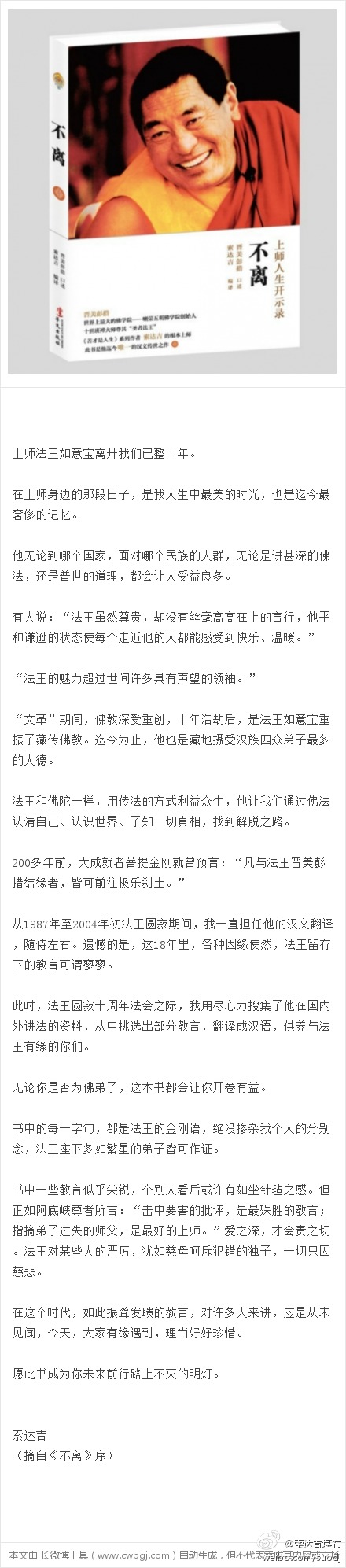 《不离》,字字句句是法王如意宝的珍贵教言。不要轻言你懂,静下心来,你将发现:它的加持力完全不同。通过这本书,愿你成为法王的有缘人,远离一切痛苦,获得一切幸福。当当网页链接京东网页链接亚马逊网页链接淘宝包邮 不离:上师人生开示录(佛学励志书<苦才是人生>作者索达吉堪布编译 法