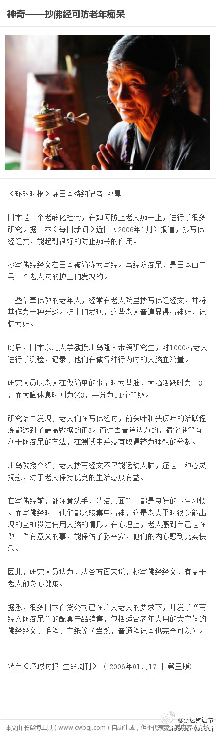 随着中国步入老龄化,“老年痴呆”这一疾病日益突显,有专家称:未来几十年,中国将成为“痴呆大国”。其实,佛法所传输的圣能量,能够开智慧、安心神,对预防此病极有帮助。我身边有许多七八十岁的学佛老人,头脑非常清晰,思维非常敏捷,也足以证明这一点。附:日本研究——抄佛经可防老年痴呆