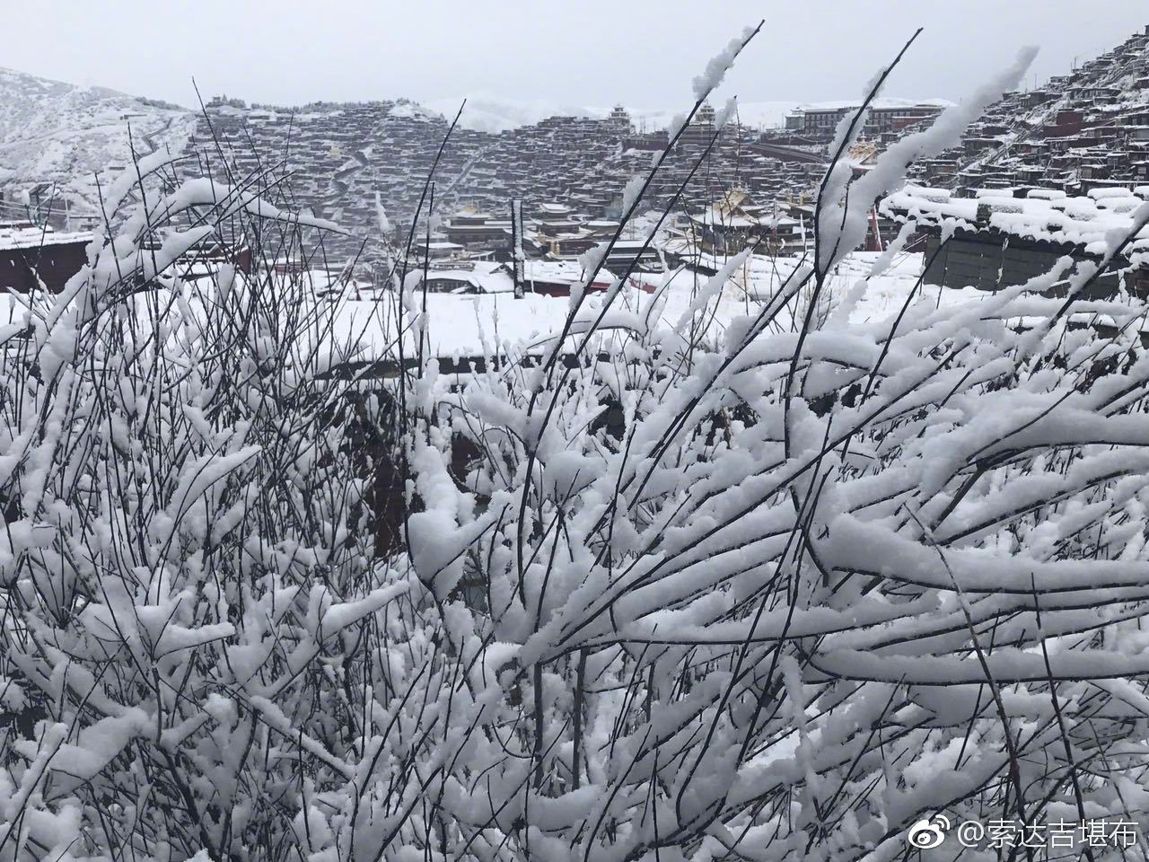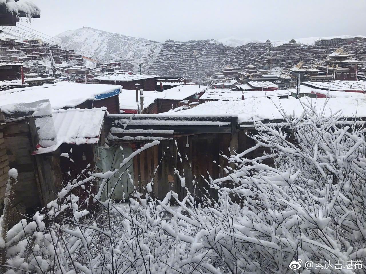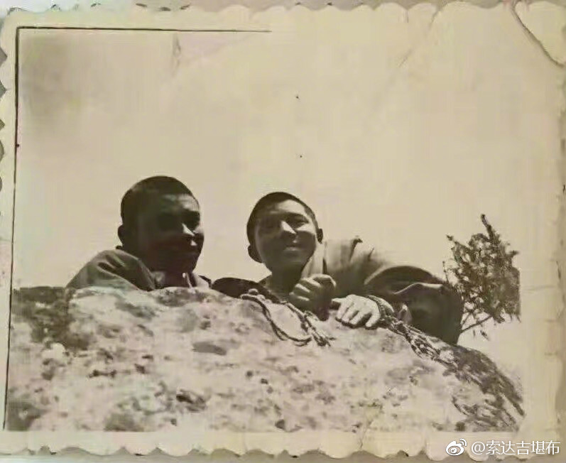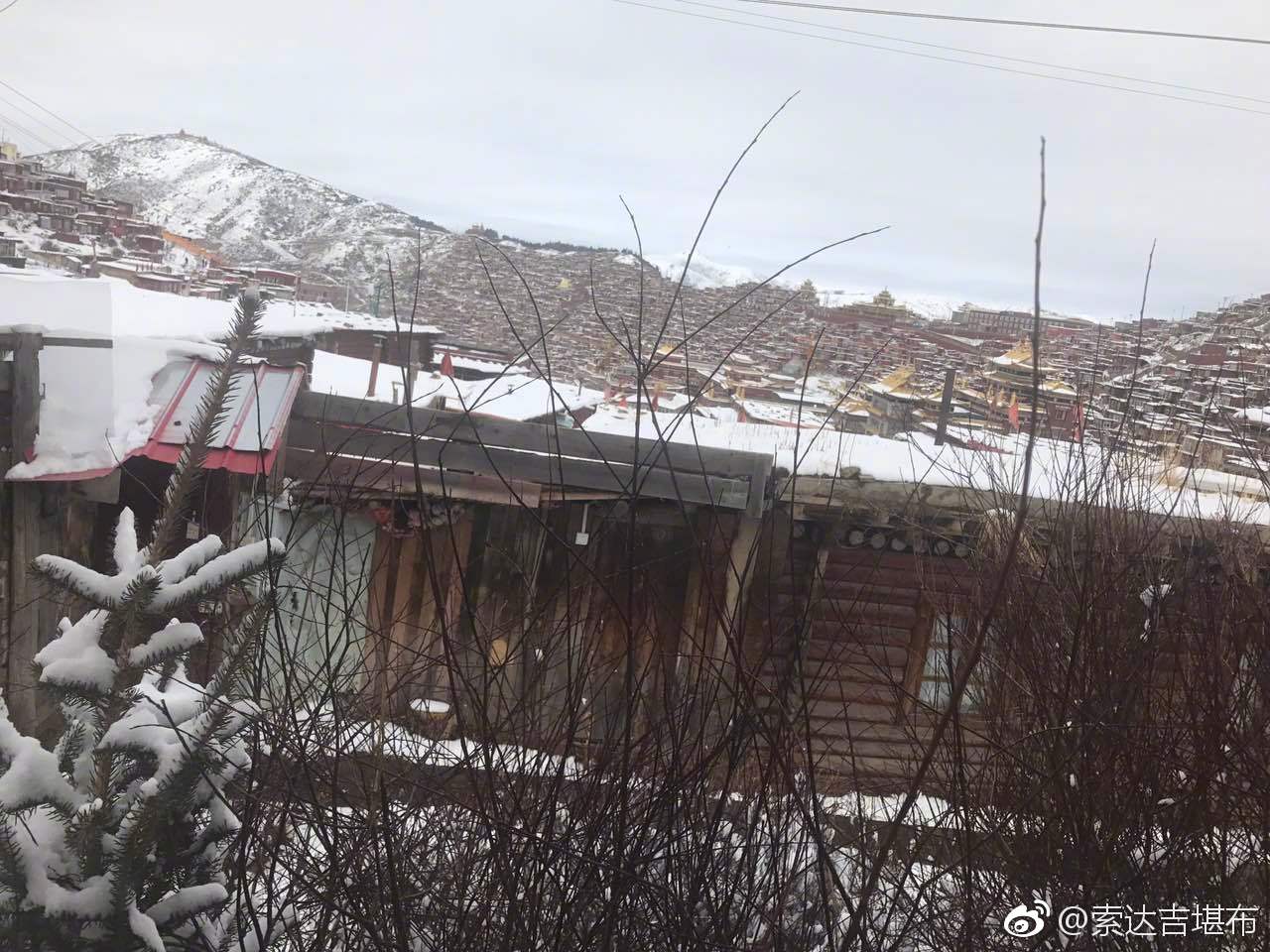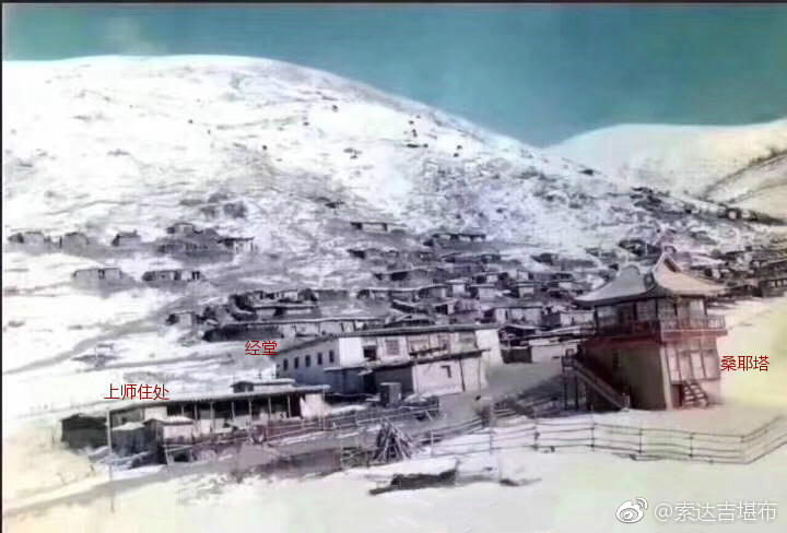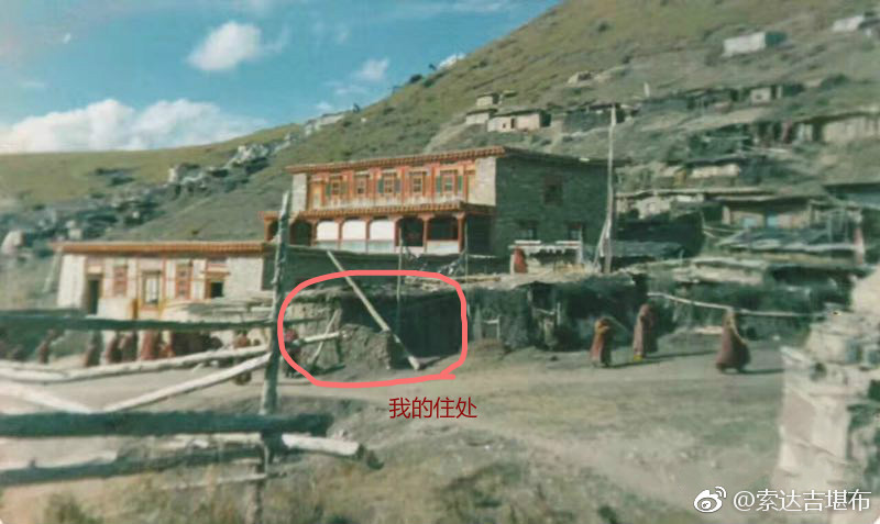 那个白色建筑是我们的经堂;红色的两层楼是桑耶塔,也是我1987年以后给汉族佛子讲课的地方;法王就住在最西边的房子里。