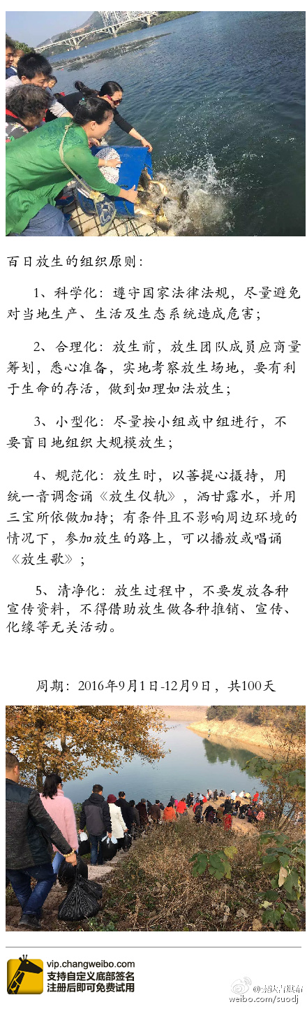 2016年“智悲百日大放生”,今天圆满了!这次放生,大家按照科学化、合理化、小型化、规范化、清净化的原则,做得很如法,我很欢喜,非常随喜大家的功德。届时,放生总数将会请僧众进行回向,祝愿世界和平、众生安乐。