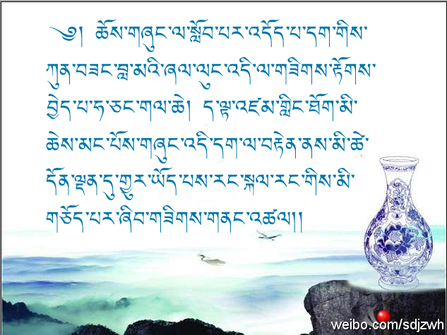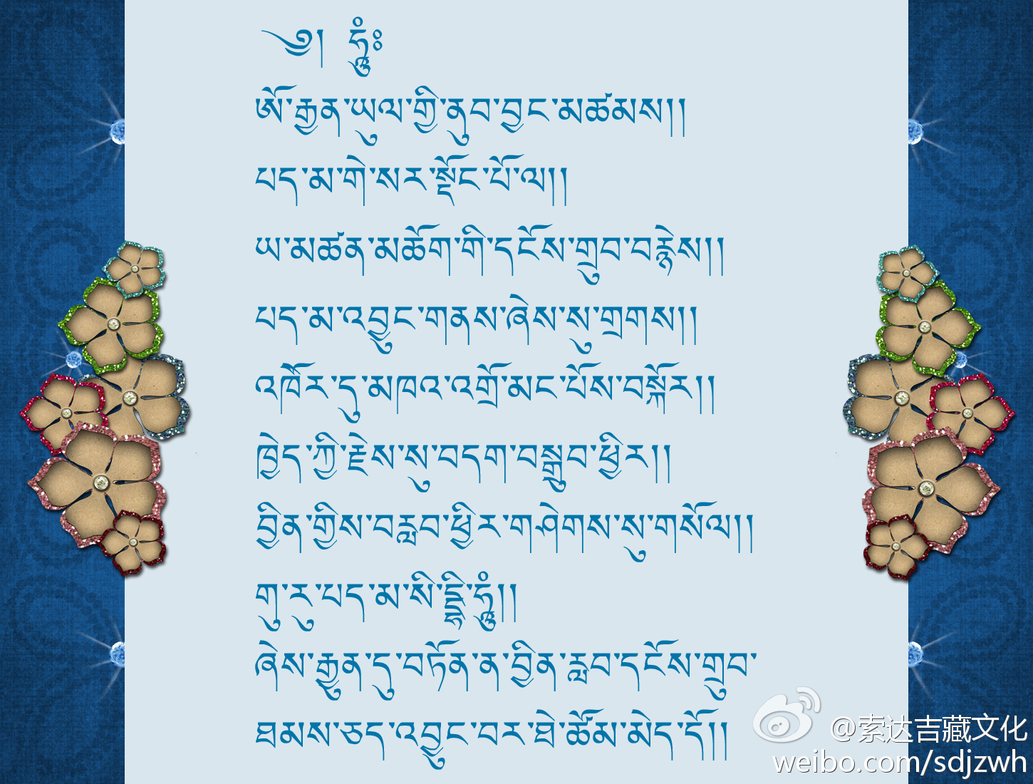 吽 邬金由吉奴江参[邬坚刹土西北隅] 贝玛给沙东波拉[莲华梗茎胚蓬上] 牙参丘给屋珠涅[得证稀有胜悉地] 贝玛窘涅谢苏札[圣名尊称莲花生] 阔杜堪卓芒波果[空行眷属众围绕] 却记杰苏答珠记[我愿随尊而修成] 钦吉拉企谢苏唆[祈请降临赐加持] 咕噜贝玛悉地吽 若能经常如此念诵,定能生起一切加持与悉地!