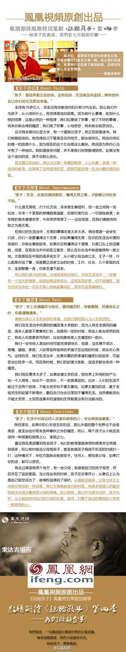 【@索达吉堪布 :没有信仰,生活就没有底线】生活总是充满变数,懂得无常之意,才能让你处变不惊;世上充满痛苦与快乐,遇到痛苦时,要健翔,恰逢快乐时,要谨慎谦卑,对身边的人要有感恩的心;培养真正的信仰会让你们的生活更加幸福。@凤凰佛教 #说给孩子#精彩回顾 视频:2013-05-31说给孩子第二季 索达吉堪布