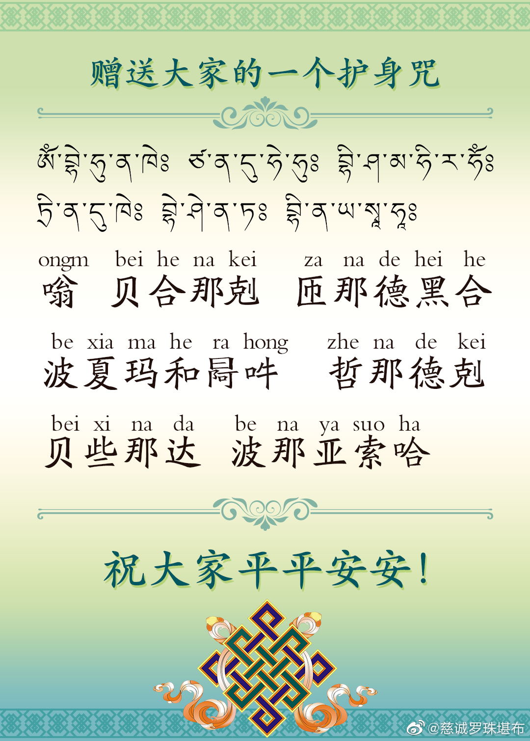 我们要精进持咒、修行,为社会、为人类祈祷。祈祷本身也是一种力量,我们无私地为众生祈祷,这个力量将无坚不摧。我们做为大乘佛子,平时就该这样做,在这样一个特殊时期,更应该把吉祥、美好的祝福送给众生。