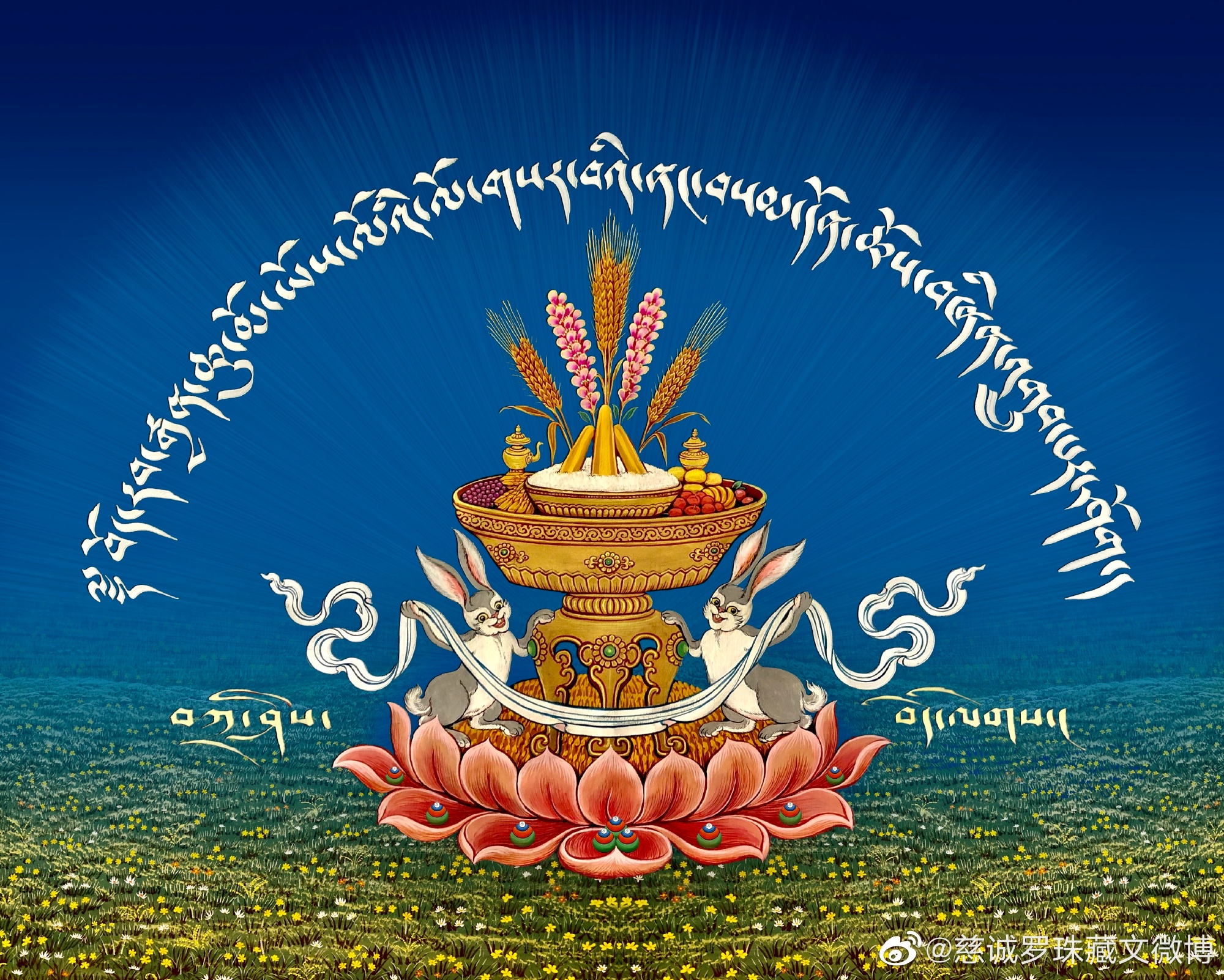 今天是藏历兔年的第一天,也是神变月的开始。为了让这个世界更和平、更吉祥,为了让我们的内心更柔软、更慈悲,希望大家多念观音心咒“嗡玛尼贝美吽ཨོཾ་མ་ཎི་པད་མེ་ཧཱུཾ།”,在最短的时间内完成一万遍。新年快乐,扎西德勒!