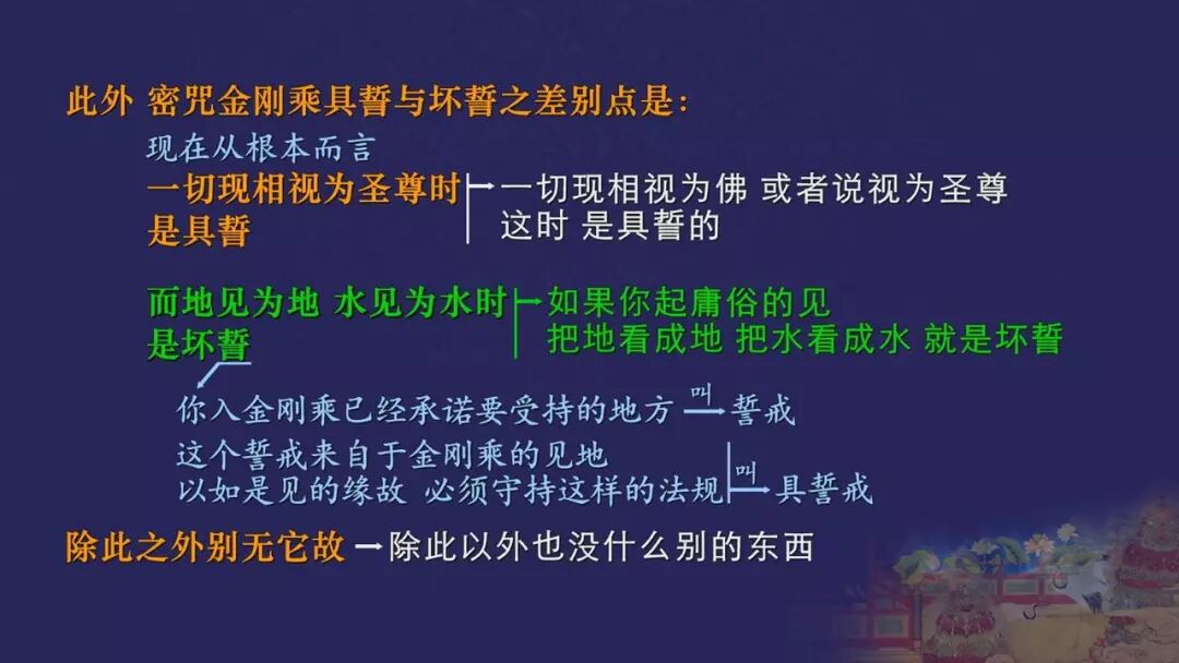 密咒金刚乘具誓和坏誓的差别点就是:一切现相视为佛,或者说视为圣尊,譬如五蕴视为五佛,五大视为五佛母,或者一切都视为法身、视为佛,这个时候是具誓的;如果你起庸俗的见,把地看成地,把水看成水,就是坏誓。