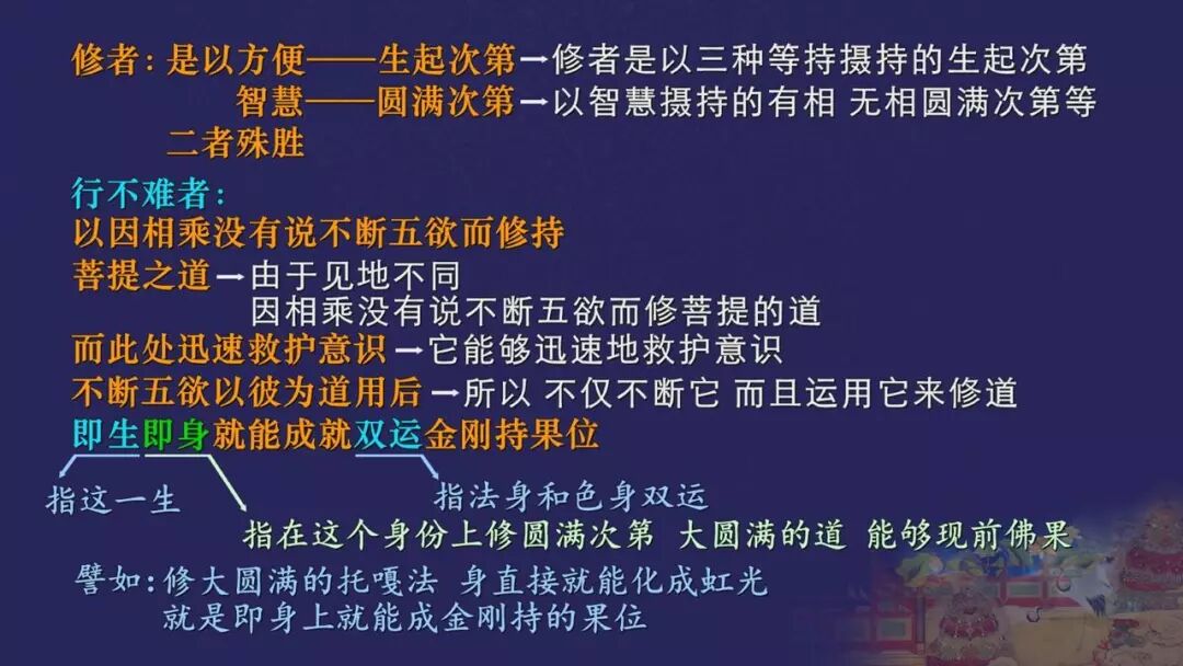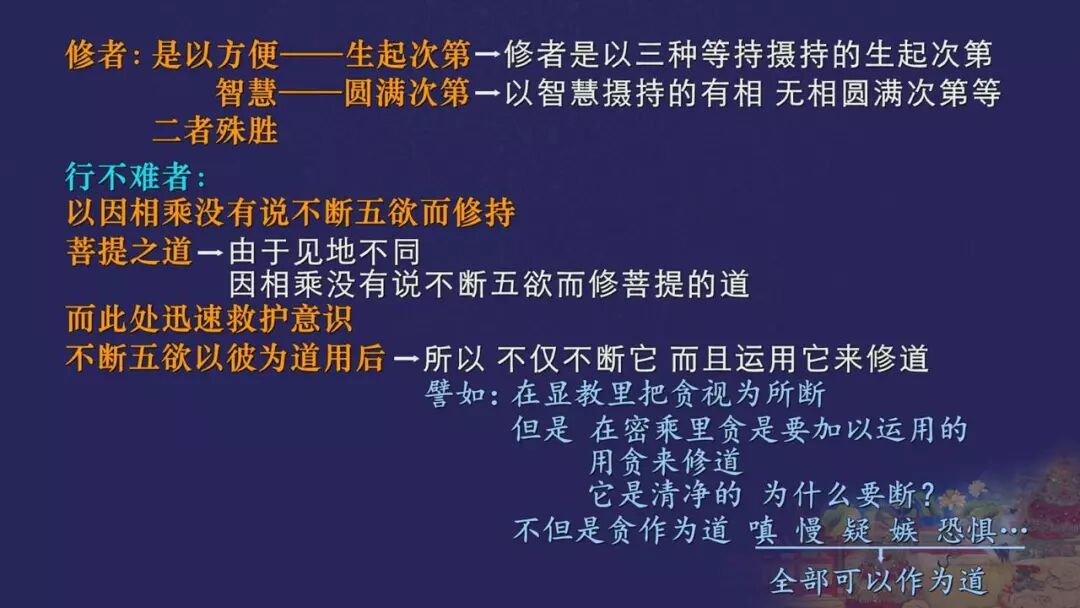 行不难者:以因相乘没有说不断五欲而修持菩提之道,而此处迅速救护意识、不断五欲以彼为道用后,即生即身就能成就双运金刚持果位,故殊胜。