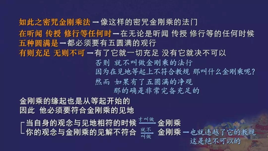 像这样的密咒金刚乘的法门,在无论是听闻、传授、修行等的任何时候,都必须要有五圆满的观行。