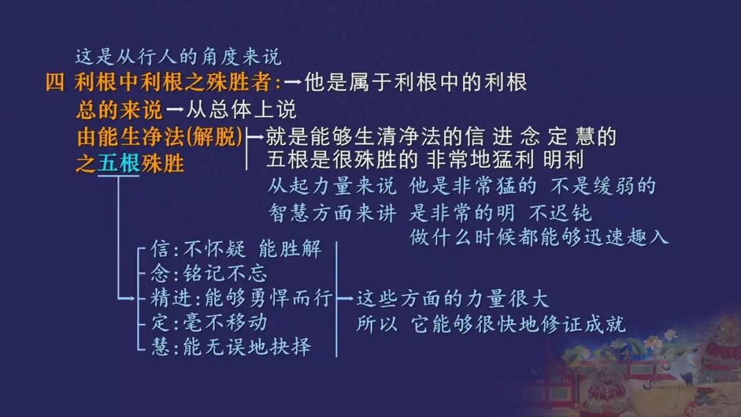 从总体上说,就是能够生清净法的信、进、念、定、慧的五根是很殊胜的,非常地猛利、明利。