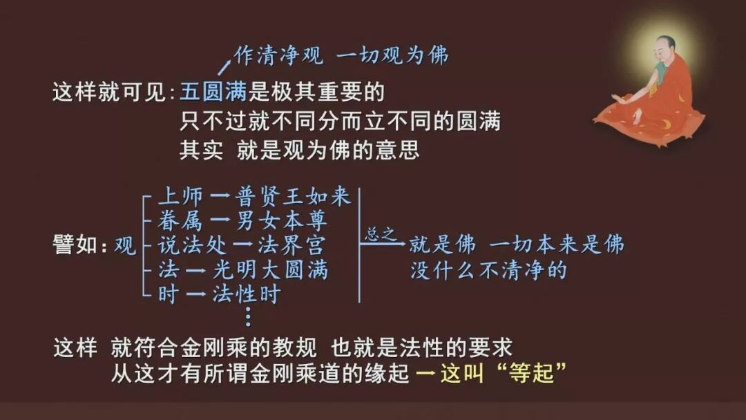 总而言之就是佛,一切本来是佛,没什么不清净的。这样就符合金刚乘的教规,也就是法性的要求,从这里才有所谓金刚乘道的缘起,这叫“等起”。