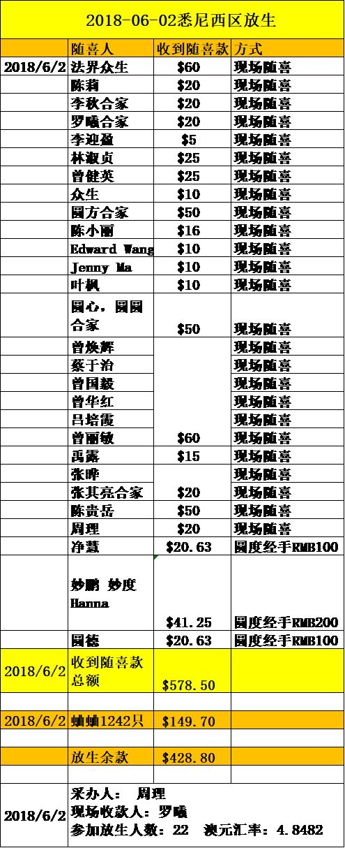 【放生报道】悉尼西区6月2日放生报道(附随喜款明细)