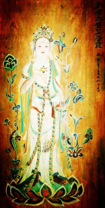 大势至菩萨的肉髻像红莲花,肉髻上有一宝瓶,内装智慧光明,用以济度一切众生。