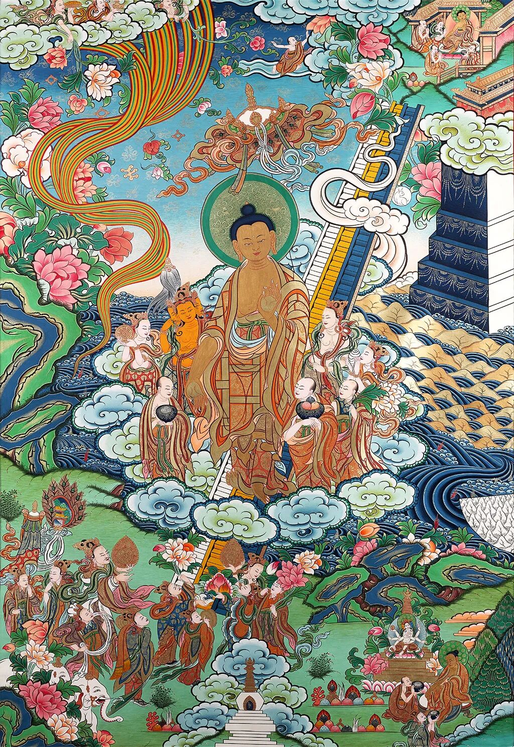 佛陀在忉利天说法圆满后,准备返回人间。帝释天王为了表达对佛的无上崇敬,施展神通从忉利天宫善法堂到人间变现出金、银、琉璃三道宝阶。佛陀从善法堂起身,从中间的黄金台阶下,天神大众后面跟从。帝释天王手拿宝盖,从水晶台阶侍奉在左侧而下;大梵天王手执白拂,从白银台阶侍奉在右侧而下。天神天女腾空,散落天花赞美。
