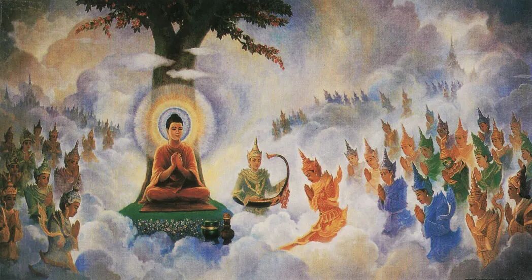 佛陀为什么要这样?当时外道都来跟佛比神通,佛不跟他们比。外道都崇拜他们的天主,但是他们修了一辈子,也很少能修到天神现出来给他看。佛不跟他们比神通,但最后从天上下来的时候,所有这些天神都陪着佛一起下来了。佛陀化解了这个争论,不用武力,也不用辩论,让外道们自己去思悟,这就是佛陀的慈悲。