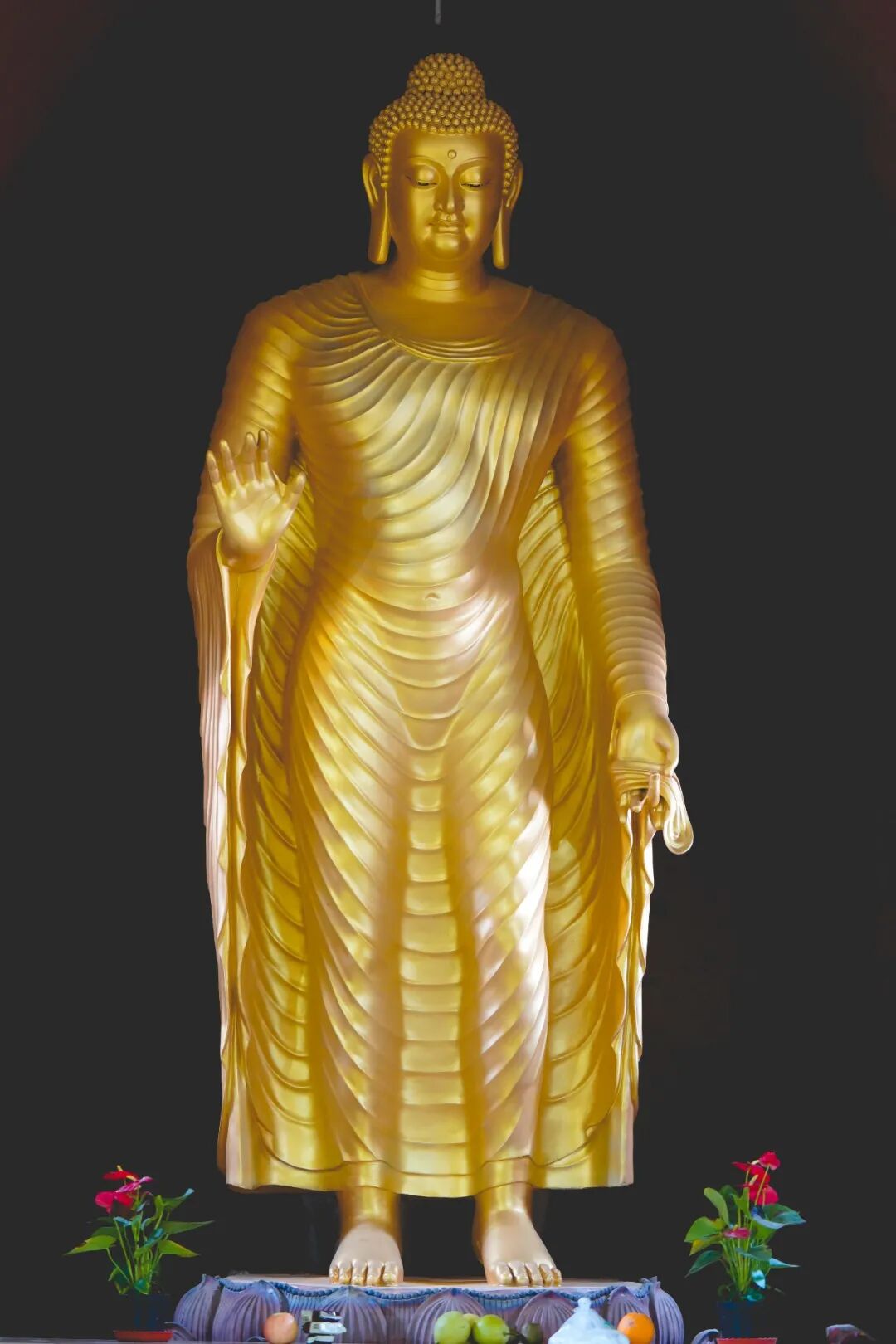 佛到忉利天宫为母亲说法,三月未归,人间最早的佛像就是在这期间造的。当时优填王由于敬仰佛陀,思慕成疾,于是请目犍连尊者运用神通力,将工匠带到天宫瞻礼世尊而造像。佛像以牛头旃檀木为材质,高五尺,呈站姿,右手结施无畏印,左手结施与印,身着通肩袈裟。