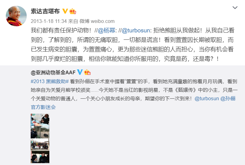 我们都有责任保护动物!//@杨幂: //@turbosun: 拒绝熊胆从我做起!从我自己看到的,了解到的,所谓的无痛取胆,一切都是谎言!看到萱萱因长期被取胆,而已发生病变的胆囊,为萱萱痛心,更为那些迷信熊胆的人而担心,当你有机会看到那几乎糜烂的胆囊,相信你就能知道你所服用的,究竟是药,还是毒?!