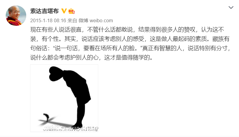 现在有些人说话很直,不管什么话都敢说,结果得到很多人的赞叹,认为这不装,有个性。其实,说话应该考虑别人的感受,这是做人最起码的素质。藏族有句俗话:“说一句话,要看在场所有人的脸。”真正有智慧的人,说话特别有分寸,说什么都会考虑护别人的心,这才是值得随学的。