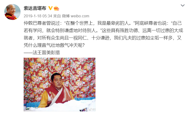 仲敦巴尊者曾说过:“在整个世界上,我是最卑劣的人。”阿底峡尊者也说:“自己若有学问,就会特别谦虚地对待别人。”这些具有殊胜功德、远离一切过患的大成就者,对所有众生尚且一视同仁、十分谦逊,我们凡夫的过患如尘垢一样多,又凭什么理直气壮地傲气冲天呢?