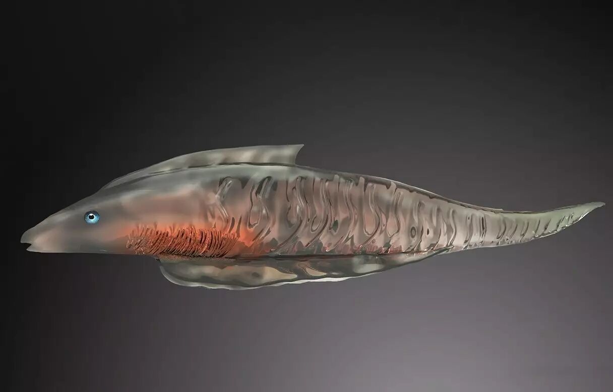 (首次发现于云南澄江,昆明鱼复原图,绘图@Masato Hattori)