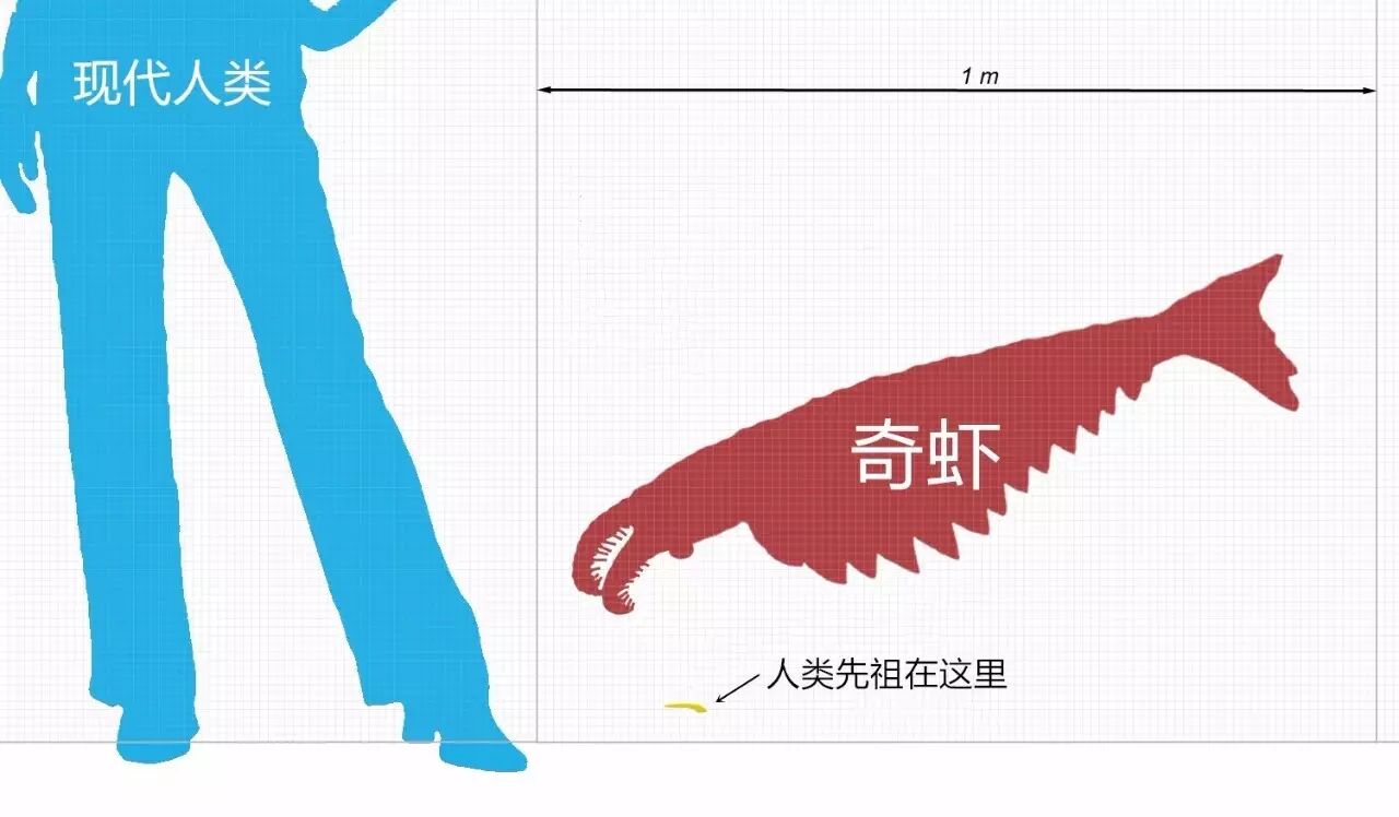 (奇虾与人类先祖、现代人类大小对比图,图片源自Wikiwand,星球研究所标注并有修改)