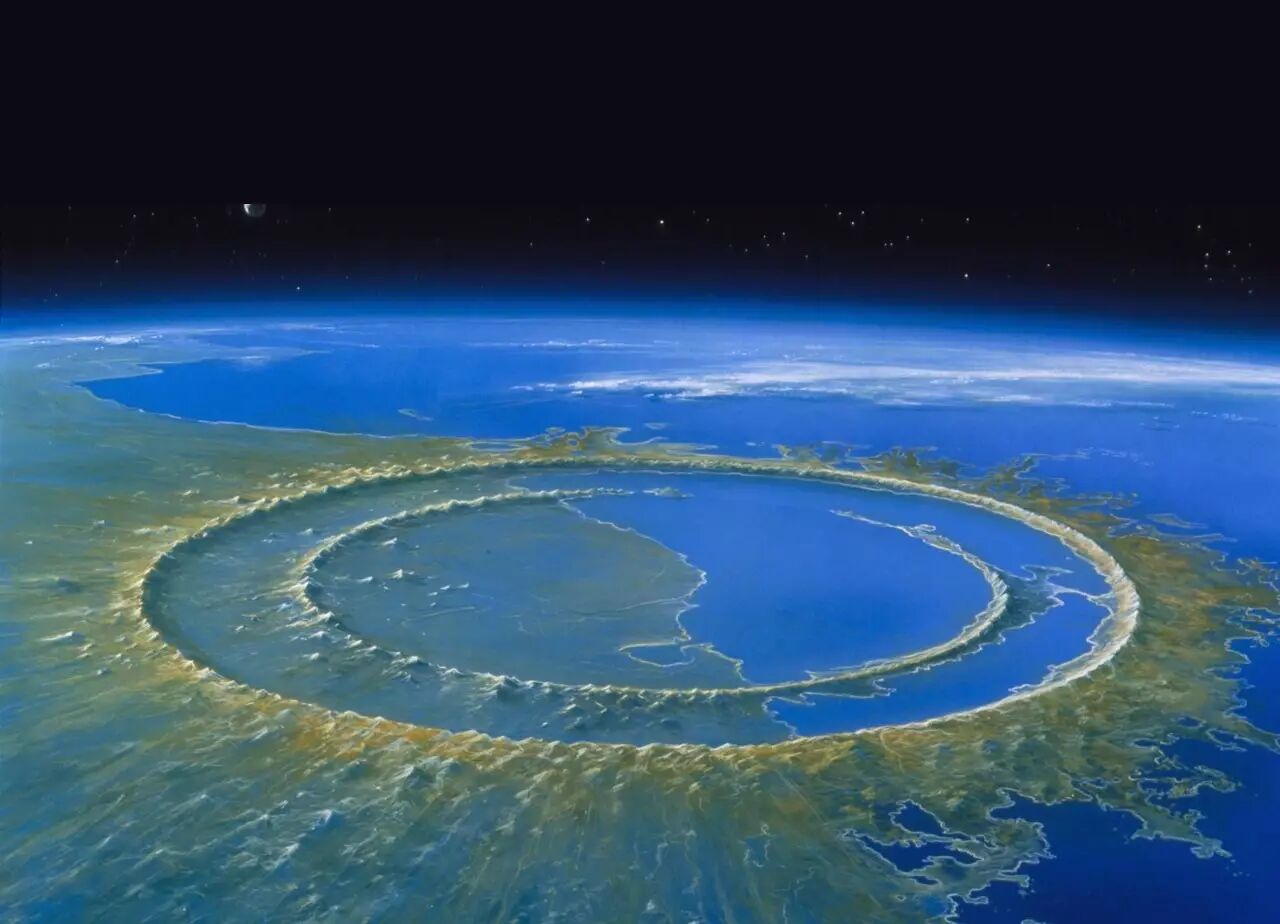 (现在又出现了新的灭绝假说,此处不做讨论;小行星撞击后地表的陨石坑想像图,绘图@Detlev Van Ravenswaay/《Science》杂志)