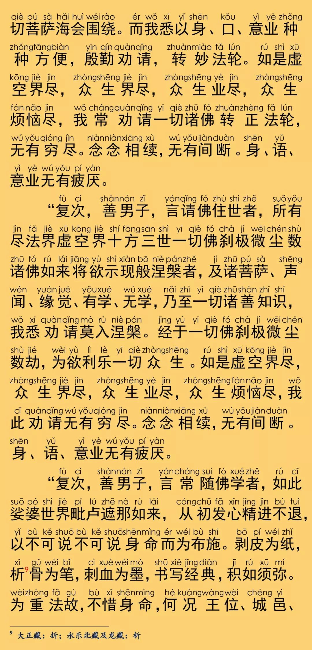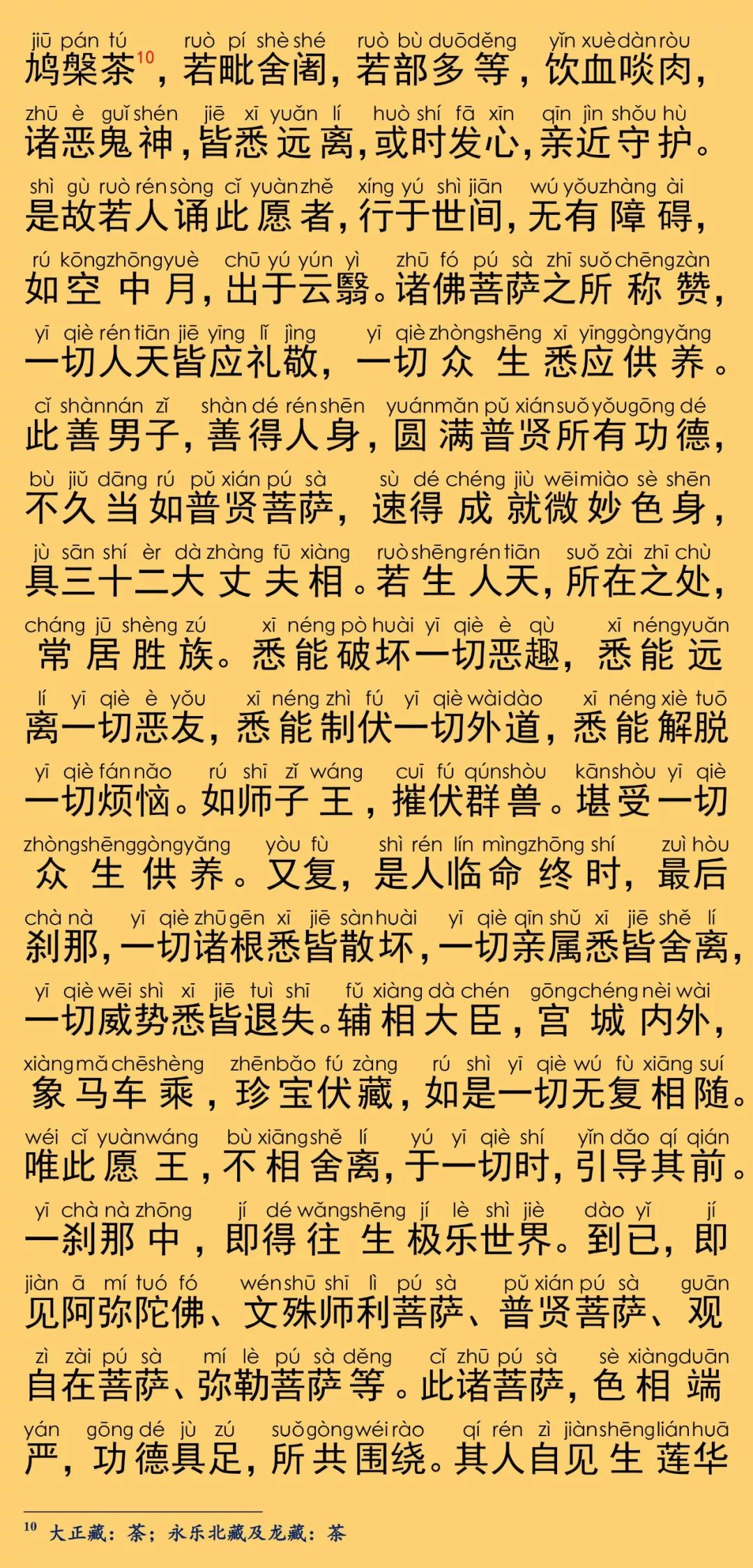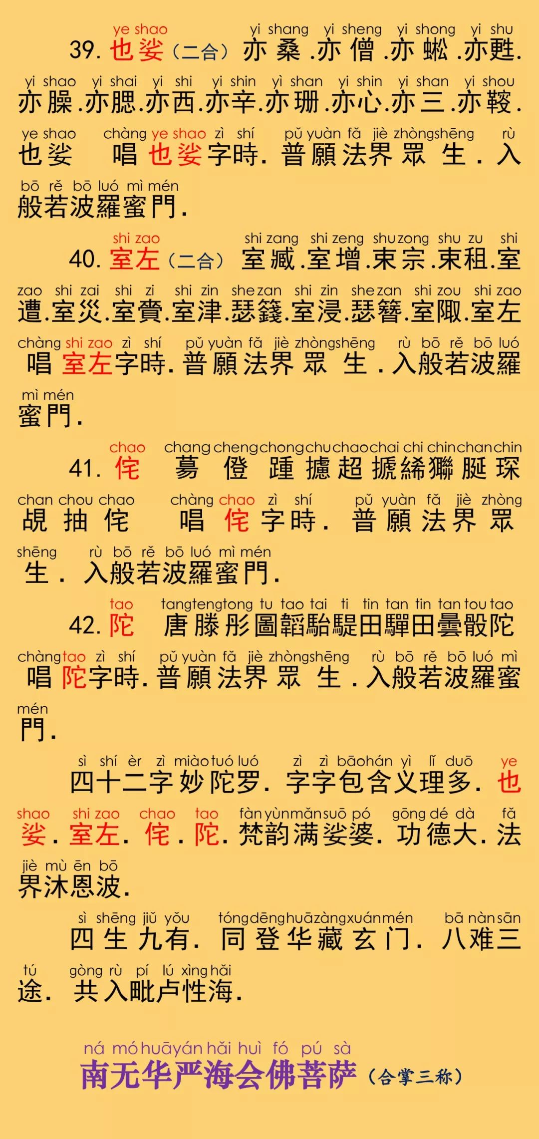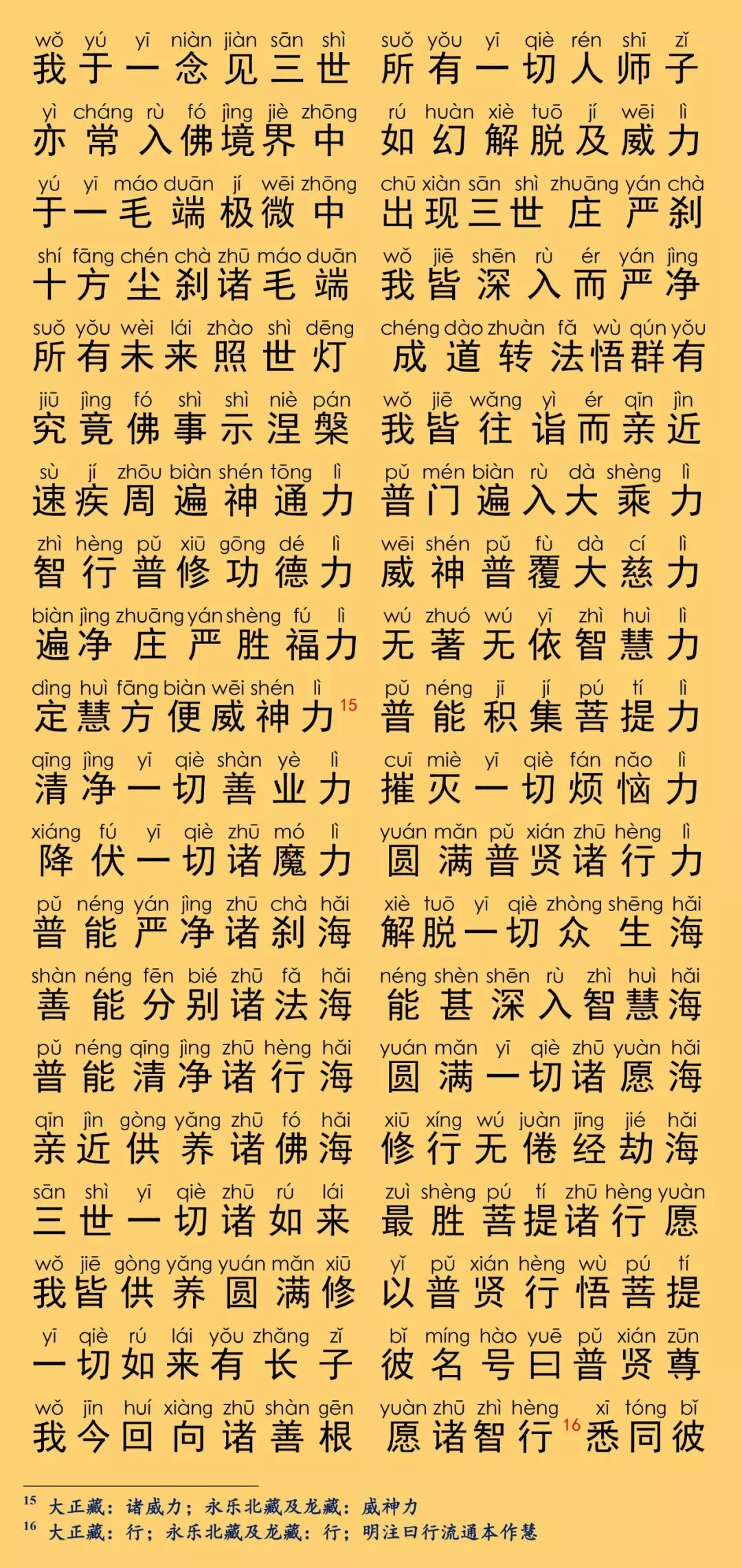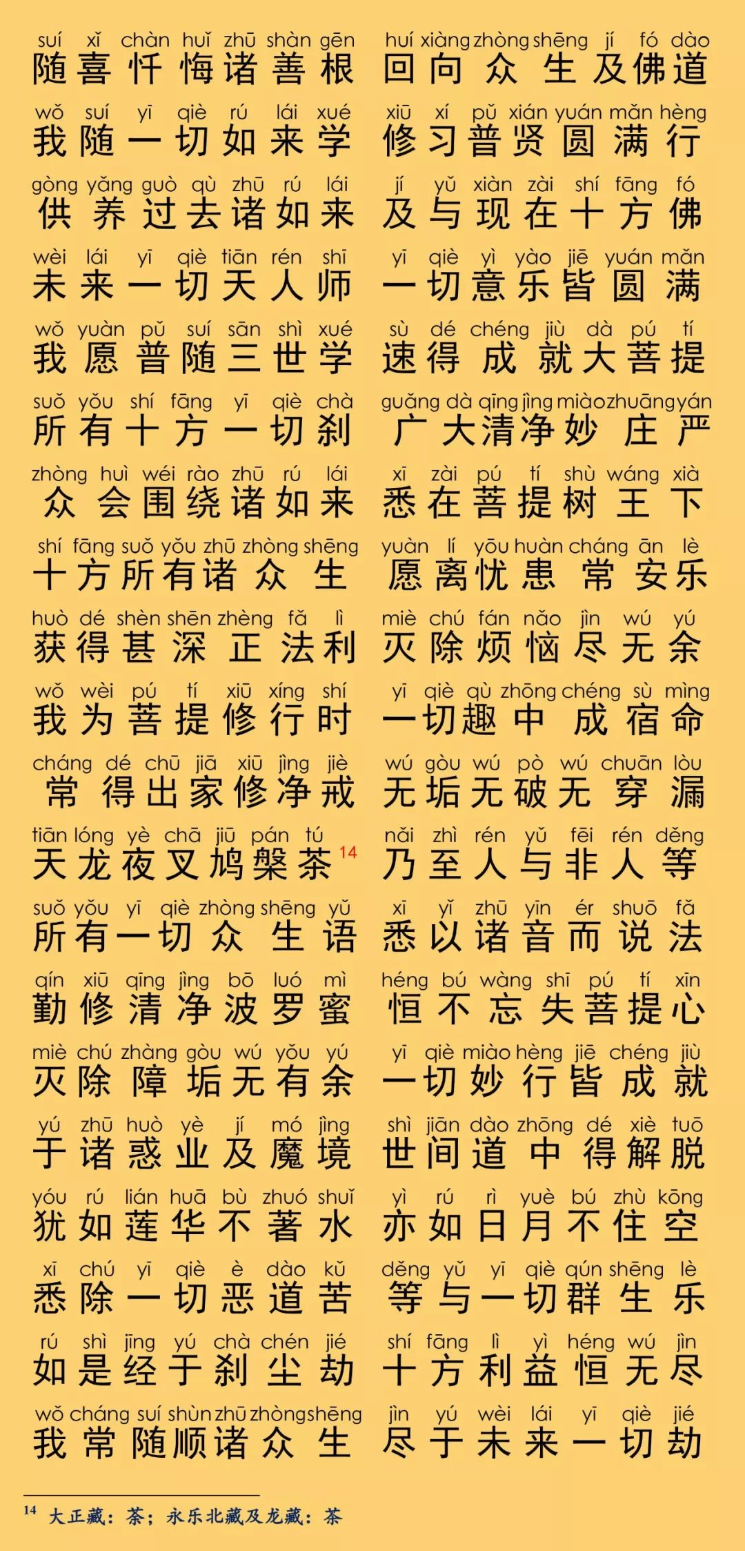 根据《乾隆大藏经》大乘华严部,第0085部,唐罽宾三藏般若奉诏译《大方广佛华严经普贤菩萨行愿品》(卷第四十)原藏影印本校正注音。读诵仪轨取自福建莆田广化寺《大方广佛华严经》印本,华严字母根据柏林禅寺《华严字母》印本校正,句读及注音仅供参考。每卷的三个华严字母梵唱音频与该卷的华严字母相对应,由印能法师唱诵,至七十三卷后,每卷为四个华严字母。设计排版说明:本注音佛经内容,由仁慧草堂编辑设计制作,如需转载请联系作者公众号,特此说明。