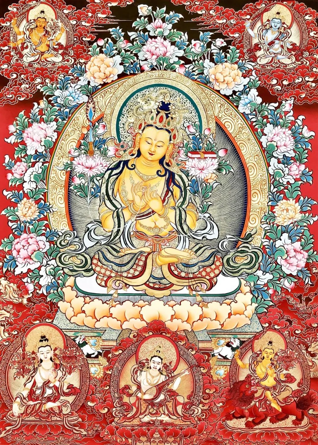 师微博:https://weibo.com/u/17697872851、持诵文殊智慧咒的主要功德利益,据佛经记载为:罪障消灭,获无尽辩才,所求世间,出世间事悉得成就,令众生智慧成就。 2、若善男子善女人,有能受持此陀罗尼者,即入如来一切法平等,一切文字亦皆平等,速得成就摩诃般若。才诵一遍,如持一切八万四千修多罗藏。 3、若能一心独处闲静,梵书五字轮坛,依法念诵满一月已,文殊菩萨即现其身,或于空中演说法要。是时行者得宿命智,辩才无碍,神足自在,胜愿成就,福智具足,速能皆证如来法身。但心信受,经十六生,决成正觉。 4、或于绢素如前画像,满五十万遍亦得成就,或以香泥涂舍利塔,梵写五字旋遶念诵五十万遍,曼殊室利现其人前而为说法,常得诸佛及执金刚菩萨之所护念,一切胜愿皆悉具足。 5、若人才诵一遍,如诵八万四千十二围陀藏经,若诵两遍,文殊师利普贤随逐,四众围绕加被,是慈无畏护法善神在其人前。 6、若诵一遍,能除行人一切苦难。若诵两遍,除灭亿劫生死重罪。若诵三遍三昧现前,若诵四遍,总持不忘。若诵五遍,速成无上菩提。若想开启内心的智慧,明辨所做之事如何取舍,可一心专念文殊心咒“嗡阿惹巴匝那德”。尤其是孩子在读书时,常念文殊心咒,对学业大有助益。《大忿怒续》中说:“一切菩萨当中,文殊菩萨的加持最大。”现在有些人智慧不够,为人处事时不辨取舍、不懂分寸,若能经常祈祷文殊菩萨,不仅可以解决眼前的燃眉之急,而且,生生世世都不会变成愚昧众生。文殊菩萨,是三世诸佛的智慧总集,是一切诸佛的长子。《释尊广传》中记载:纵然是释迦牟尼佛,往昔也在他面前发过菩提心。全知麦彭仁波切说,任何人忆念文殊菩萨,就能开启世间、出世间一切智慧之门。出世间智慧,指证悟空性、无缘大悲等超胜境界;世间智慧,则是取舍因果、待人接物的道理。《宝积经》十五品的《文殊刹土庄严经》中还说:“念诵千百万佛陀的名号,也不如念文殊菩萨的名号功德大。”文殊菩萨虽现为菩萨身份,但实乃古佛再来。《宝鬘经》云:“文殊菩萨早已成佛。”《文殊菩萨净土庄严经》中也说:“文殊菩萨以菩萨形象利益众生。”另有经典言:“文殊菩萨于未来成佛。”由此可知,文殊菩萨是过去佛、现在佛、未来佛。同样是佛,诸佛的功德原本平等无别,但从文殊菩萨不共的愿力而言,若要开启智慧,他这方面的威力,决定超胜其他诸佛。藏地历代有许多大德,最喜欢念的,就是《文殊真实名经》和文殊心咒。不管是谁,也不管是什么身份,只要修持文殊法门,持诵文殊心咒“嗡阿惹巴匝那德”,那无论是修行佛法,还是为人处世,智慧都必定大大增上。《文殊根本续》中说:“纵使一刹那间忆念文殊菩萨,此功德亦不可思议。”现在世间上有些人智慧不够、精力不够,若能经常持念文殊心咒、祈祷文殊菩萨,生生世世都不会变成愚昧无知的众生。《大忿怒续》中也讲过:“一切菩萨当中,文殊菩萨的加持最大;所有佛母当中,具光佛母的加持最快。”《宝积经》十五品的《文殊刹土庄严经》中还说:“念诵千百万佛陀的名号,都不如念文殊菩萨的名号功德大。”《释尊广传》中亦言:释迦牟尼佛因地时,也在文殊菩萨面前发菩提心。文殊菩萨是三时诸佛菩萨的智慧总集,是一切诸佛的长子,佛陀经常在佛经中赞叹他。假如经常祈祷文殊菩萨,持诵心咒“嗡阿惹巴匝那德”,无垢文殊菩萨定会护佑我们,尤其是学习这部论典的人,应该会得到不可思议的加持。所以,大家平时要祈祷文殊菩萨和麦彭仁波切,有了本尊和护法神的加持,自己的所作所为必定如理如法、懂得取舍。《宝鬘经》中说:“念诵文殊菩萨名号及心咒的功德,超胜于念诵千百万亿佛陀的名号。”这该如何理解?从不同的功德而言,某些佛号的作用也不相同。比如说,在临死众生的耳边念诵“宝髻佛”名号,这个众生就不会堕入恶趣,而其他佛号没有这一作用。当然,并不是其他佛不具有这样的功德,而是因为宝髻佛以不共愿力所成就的这一功德,佛经中对此也作了宣说,对其他佛则未作明述。同理,从开启智慧而言,文殊菩萨的名号及心咒更为超胜。文殊菩萨虽现为菩萨身份,但实乃古佛再来。《宝鬘经》云:“文殊菩萨早已成佛。”《文殊菩萨净土庄严经》中也说:“文殊菩萨以菩萨形象利益众生。”另有经典言:“文殊菩萨于未来成佛。”由此可知,文殊菩萨是过去佛、现在佛、未来佛。同样是佛,诸佛名号的功德自然平等一味,但从文殊菩萨因地不共的愿力而言,若要开启智慧,念诵文殊心咒的威力,决定超胜其他诸佛名号。在我们修行当中,求文殊菩萨的加持,开启智慧是很重要的。当然有些人认为:我全部都依靠文殊菩萨,自己什么福德资粮、什么修行都不需要,其实也不是这样的。我们自己的确也需要在前世也好今世也好,积累一定的资粮,你如果一点资粮都没有的话,文殊菩萨的加持再大也有一定的困难。自己积累资粮的同时,祈祷文殊菩萨的的确确有殊胜的加持力。因此,我们很多道友经常讲:背书背不下去,马上就忘了,一定要开智慧,让文殊菩萨加持我过目不忘。很多人都希望获得智慧,尤其是我们学院当中很多法师背书的时候,辛辛苦苦背了好几天,过几天就忘得干干净净,好像一点印象都没有,就特别失望。对自己没有信心,对佛法也没有信心。但是,有时候可能与我们生生世世的业有一定的关系。有些人的确也学