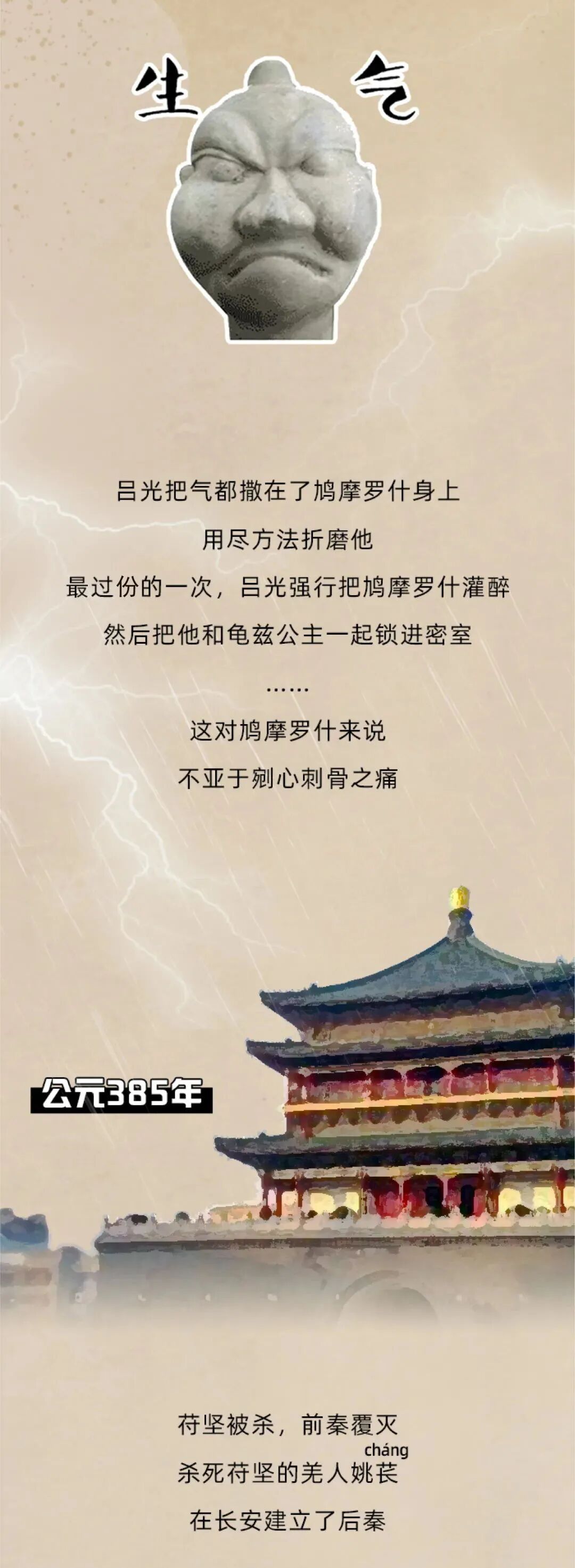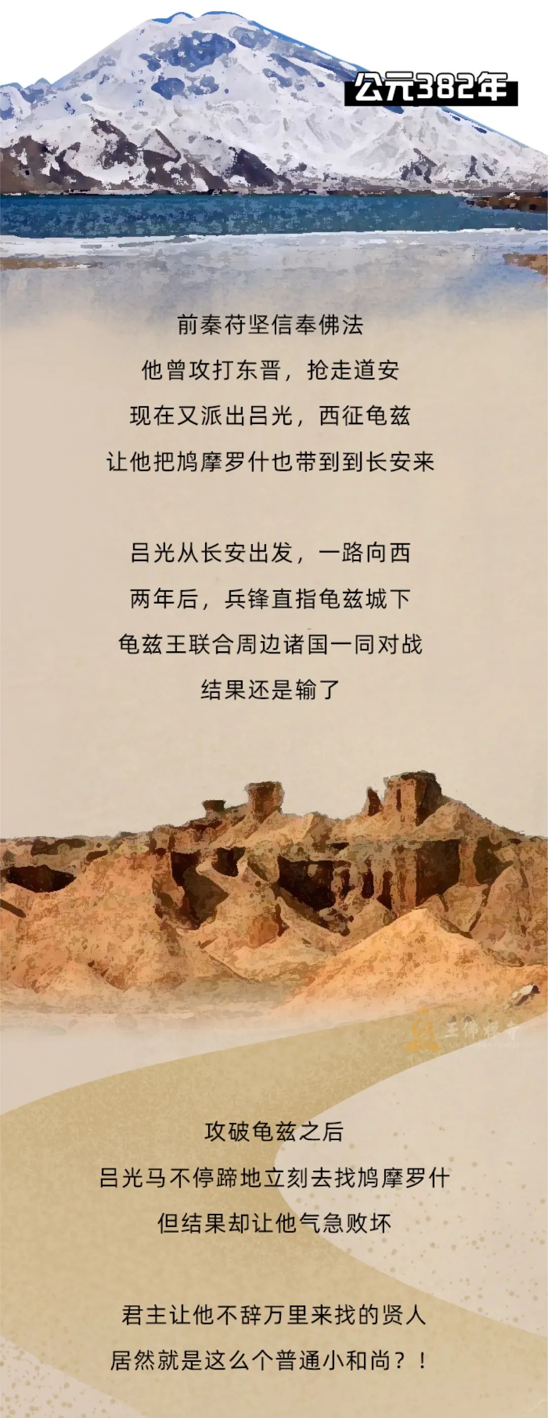 鸠摩罗什大师二十几岁时已是西域闻名的高僧,信众无数。前秦国君苻坚听闻大师大名,便派将军吕光统兵七万,前往龟兹诸国。临行,苻坚为吕光践行时说:“夫帝王应天而治,以子爱苍生为本,岂贪其地而伐之乎?正以怀道之人故也。朕闻西国有鸠摩罗什,深解法相,善闲阴阳,为后学之宗,朕甚思之。贤哲者,国之大宝。若克龟兹,即驰驿送什。”