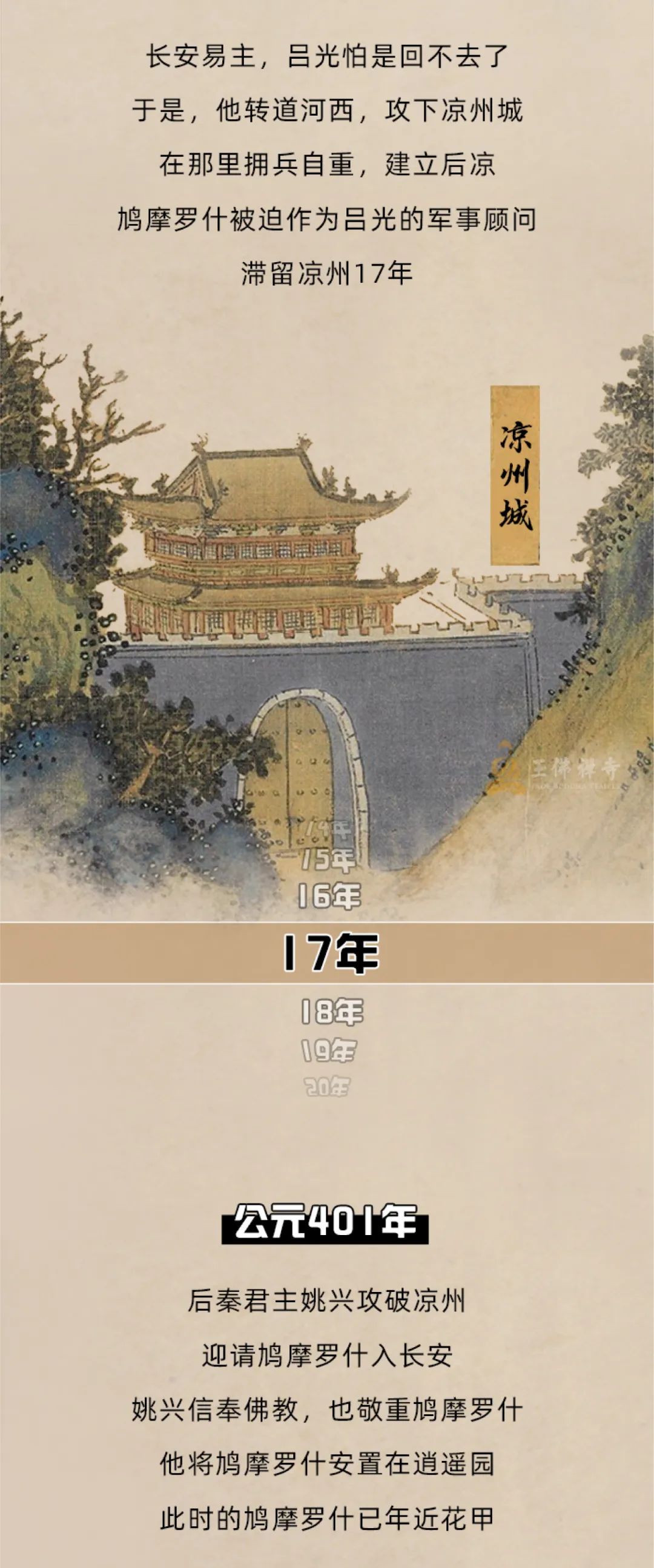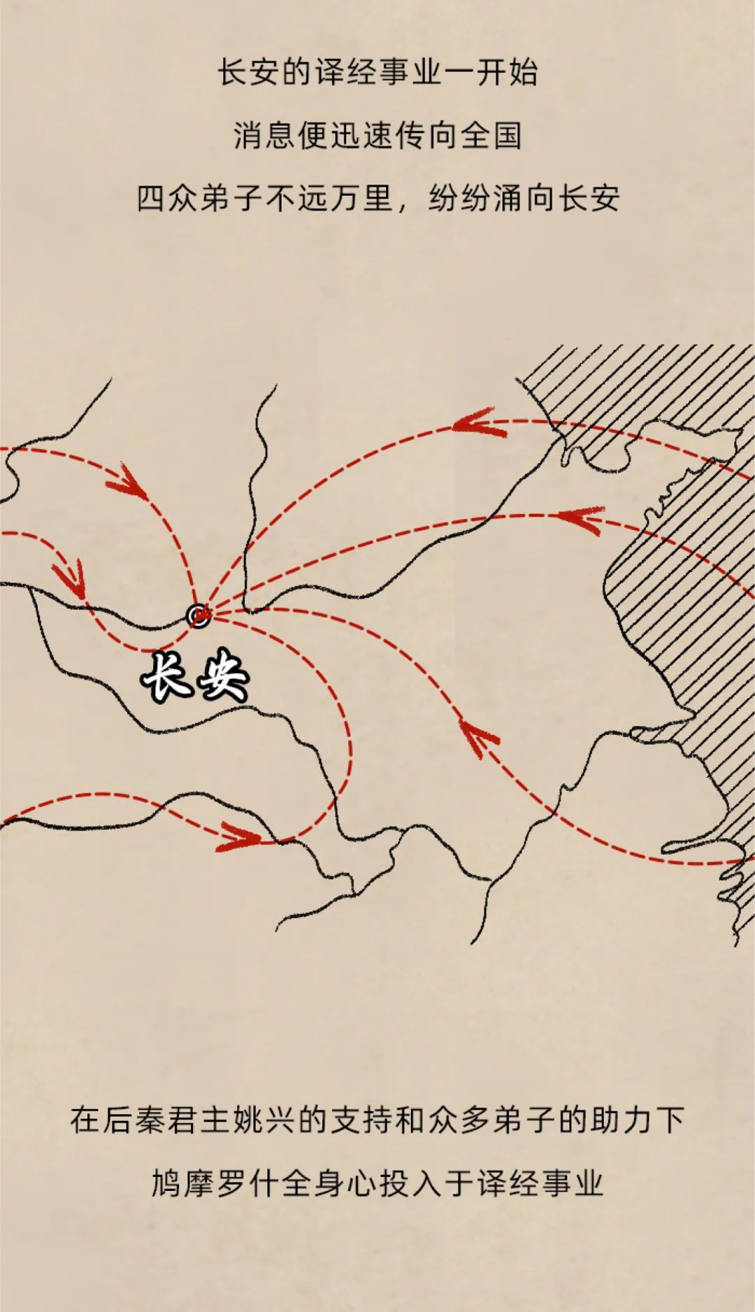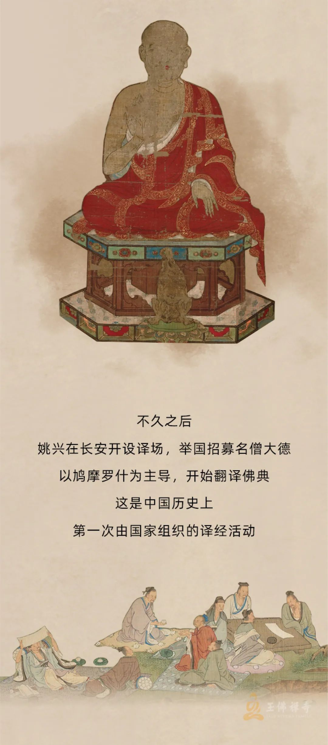 公元401年,后秦新君姚兴发兵后凉,大败凉军,迎请鸠摩罗什进入长安,并以国师礼待,在长安组织了规模宏大的译场,请鸠摩罗什大师主持译经事业,这一年,大师已经五十八岁。从此,鸠摩罗什大师在长安逍遥园和西明阁译经说法,招收弟子,开启了恢弘的译经生涯。