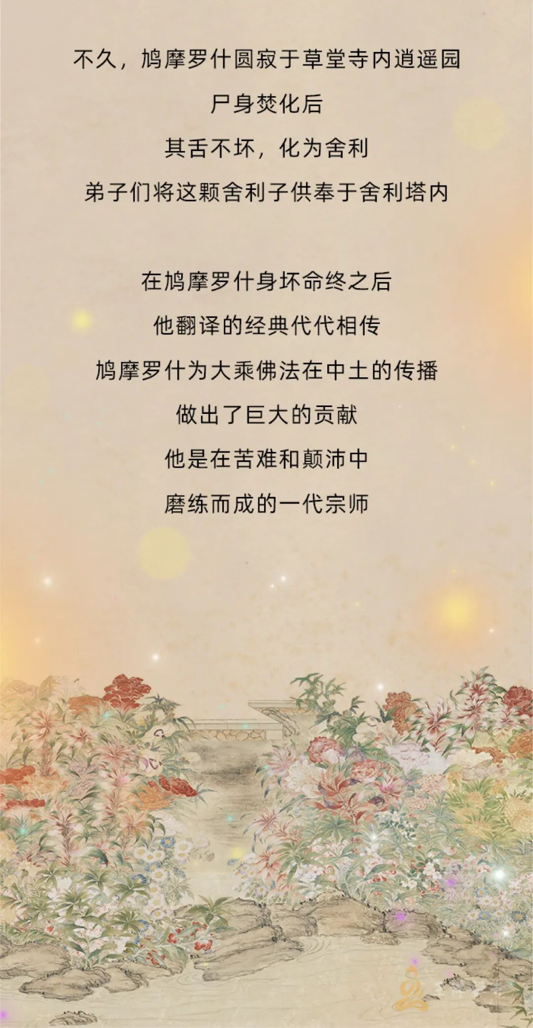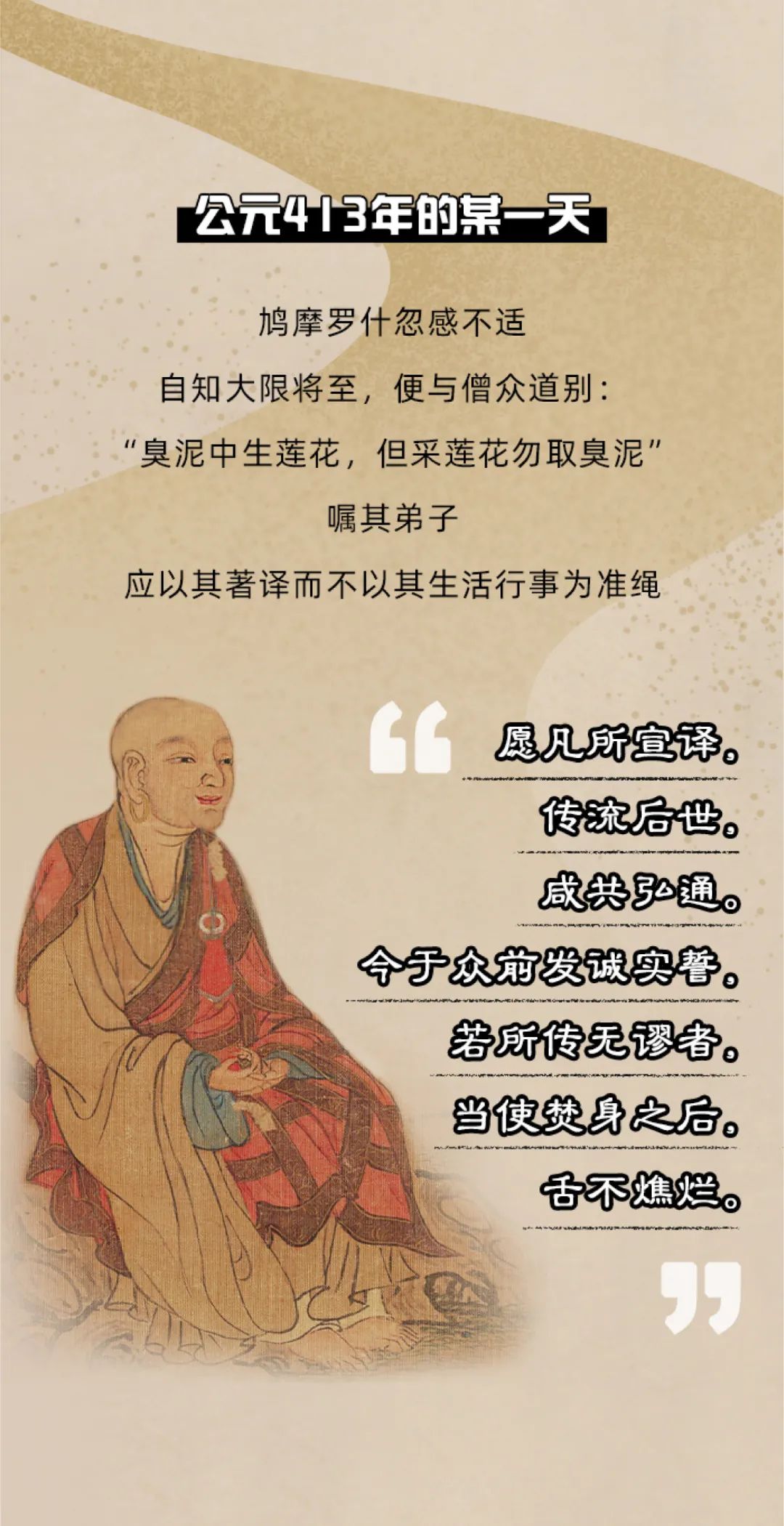 史书上记载,鸠摩罗什大师的母亲是位证果的菩萨,了达一切因缘。母亲曾告诉他,他将来会去往东土传经说法,但途中将历尽坎坷磨难。鸠摩罗什大师回答说:“大乘菩萨之道,要利益别人而忘却自己。假如我能够使佛陀的教化在中土流传,就算粉身碎骨,也在所不惜。”