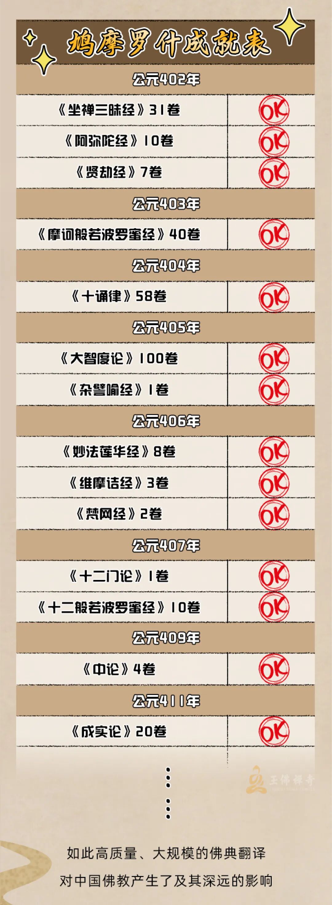鸠摩罗什法师率弟子僧肇等八百余人,共译出《摩诃般若波罗蜜多心经》《妙法莲华经》《维摩诘经》《佛说阿弥陀经》《金刚经》等经典,以及《中观论》《百论》《十二门论》和《大智度论》等论典,合计共七十四部,三百八十四卷。