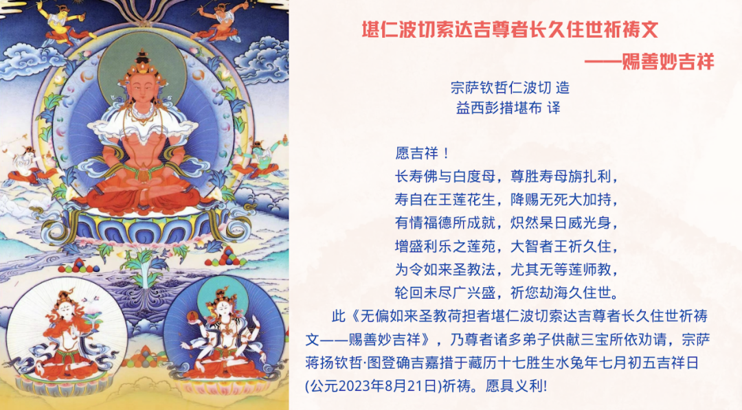 此《无偏如来圣教荷担者堪仁波切索达吉尊者长久住世祈祷文——赐善妙吉祥》,乃尊者诸多弟子供献三宝所依劝请,宗萨蒋扬钦哲·图登确吉嘉措于藏历十七胜生水兔年七月初五吉祥日(公元2023年8月21日)祈祷。愿具义利!