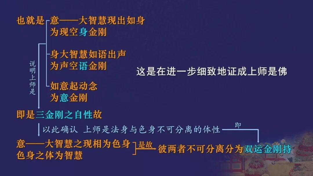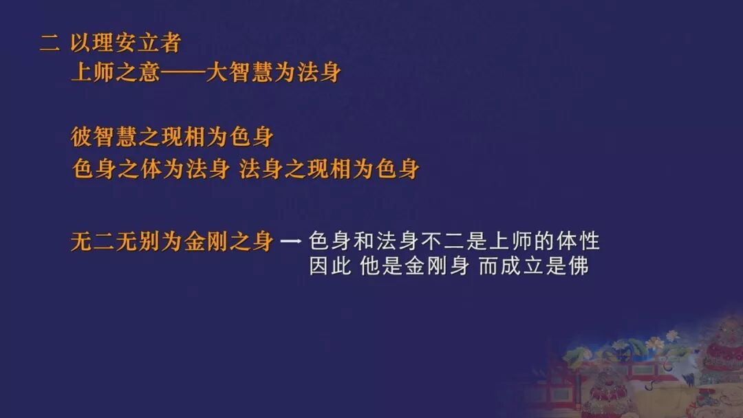 二、以理安立者,上师之意——大智慧为法身,彼智慧之现相为色身,色身之体为法身,法身之现相为色身,无二无别为金刚之身。