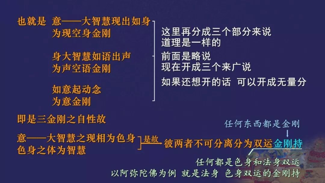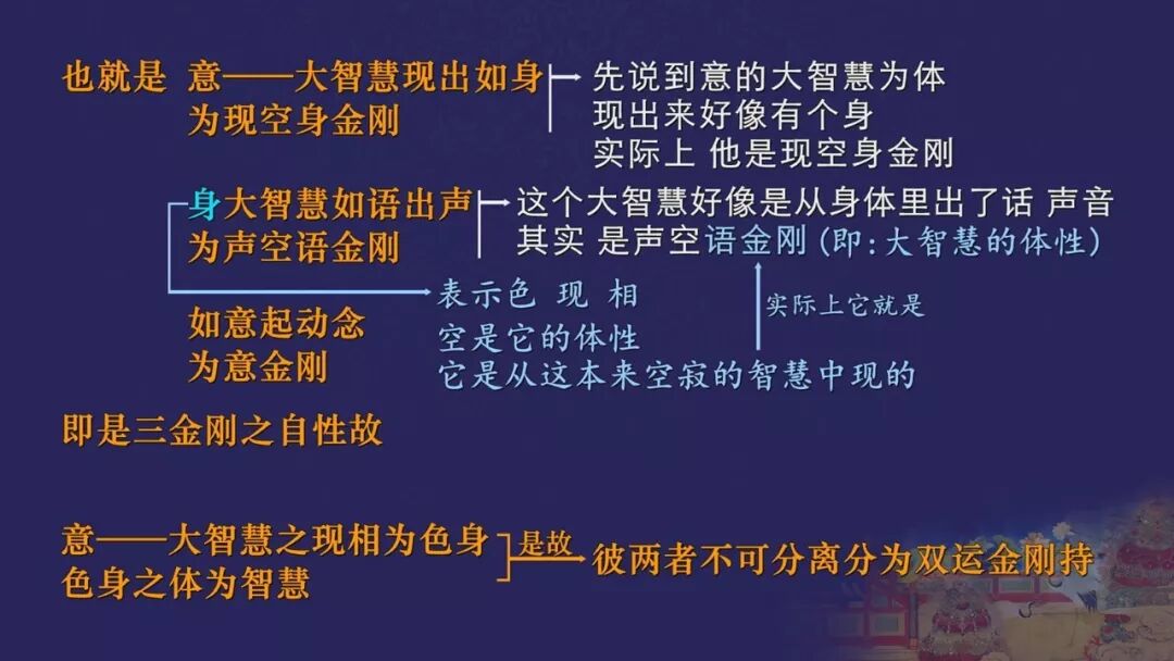 也就是意——大智慧现出如身,为现空身金刚。身大智慧如语出声,为声空语金刚。如意起动念,为意金刚,即是三金刚之自性故,意——大智慧之现相为色身,色身之体为智慧,是故彼两者不可分离分为双运金刚持。