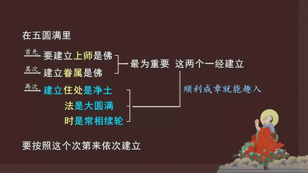 那么在五圆满里,首先要建立上师是佛,其次建立眷属是佛,再次建立住处是净土,法是大圆满,时是常相续轮。