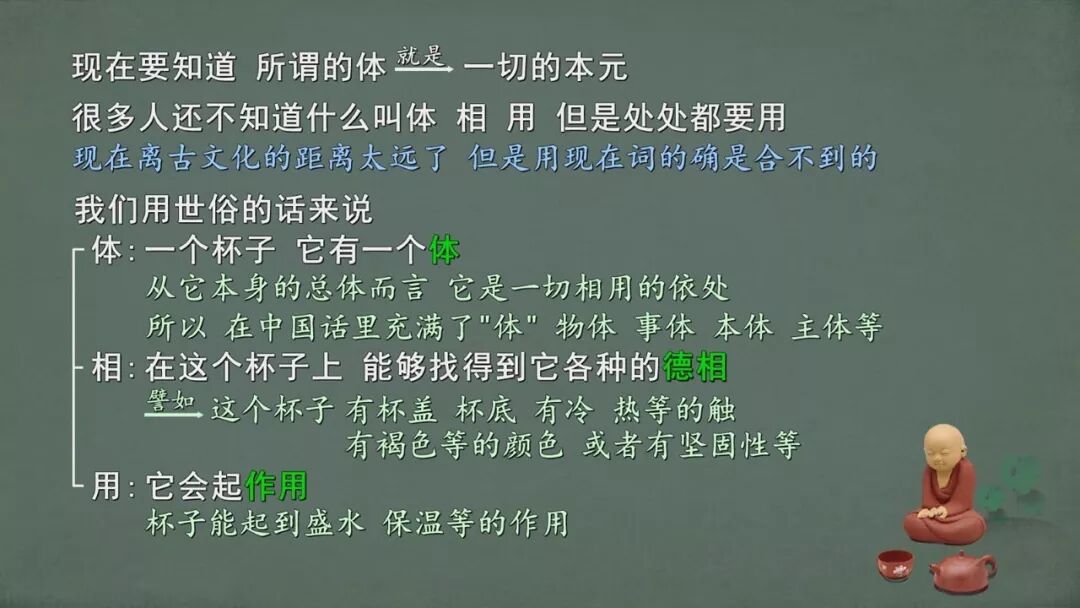 我们用世俗的话来说,一个杯子它有一个体,那么在这个杯子上能够找得到它各种的德相,这个就叫相,而且它会起作用。