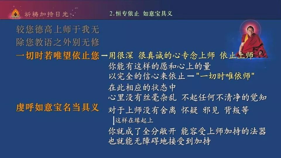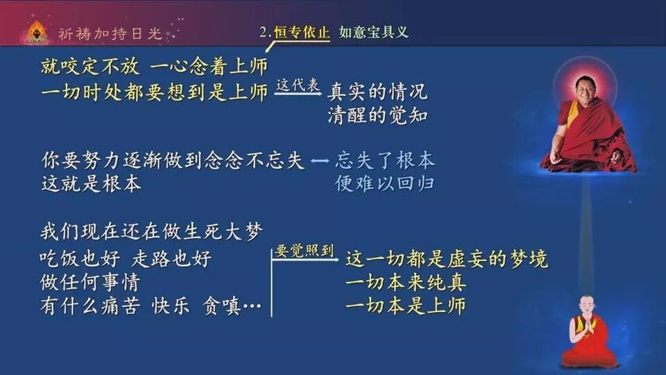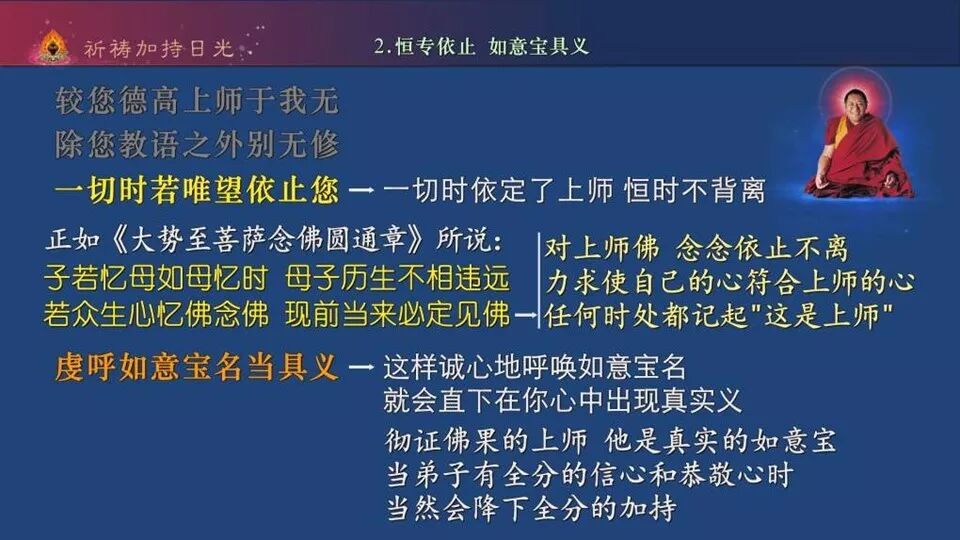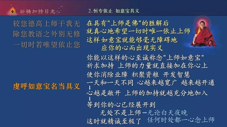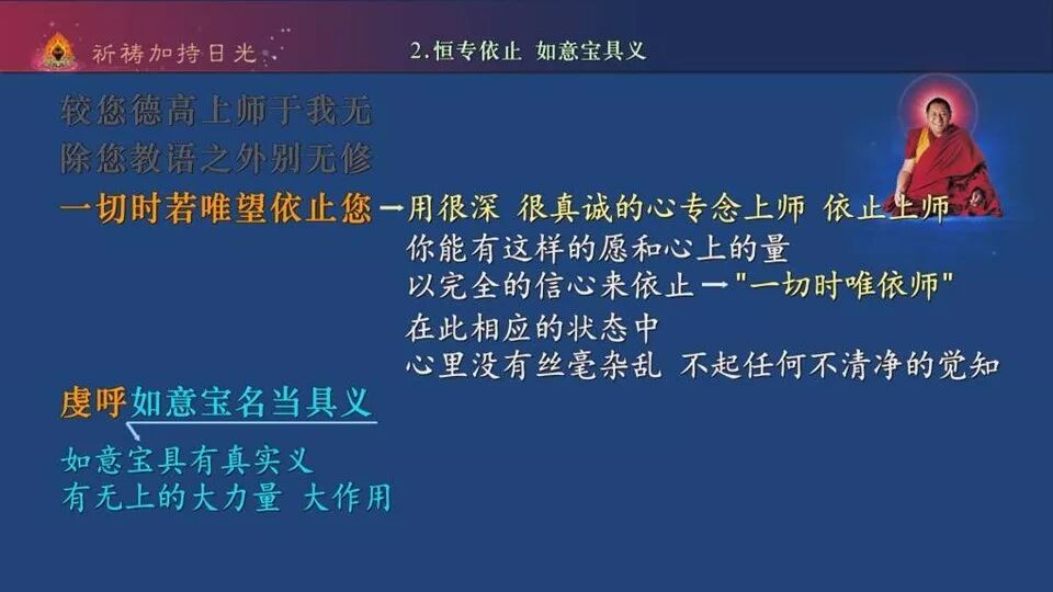 也就是一切时依定了上师,恒时不背离,并且诚心地呼唤如意宝名,就会直下在自己的心中出现真实义。
