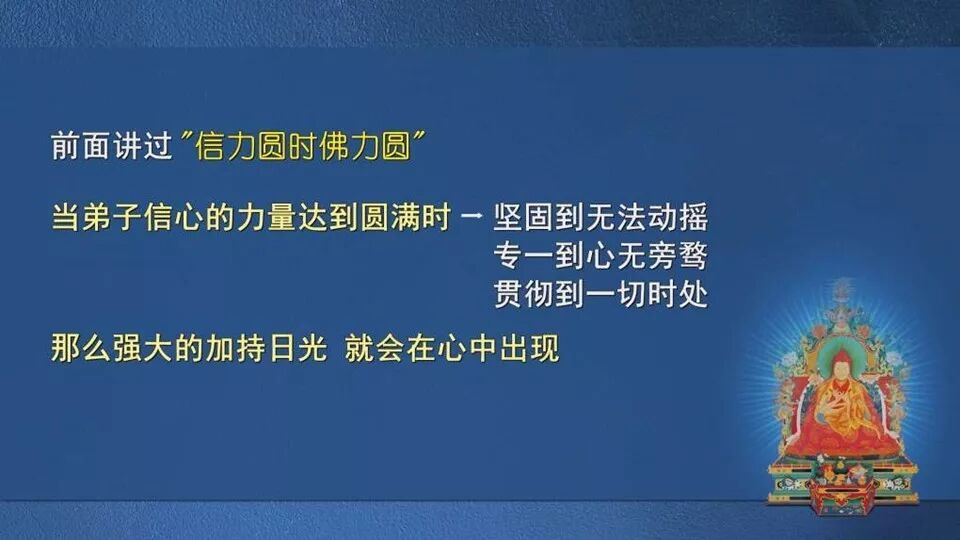 上文所说“信力圆时佛力圆”,是指当弟子信心的力量达到圆满、坚固到无法动摇、专一到心无旁骛,贯彻到一切时处,那么强大的加持日光,就会在心中出现。