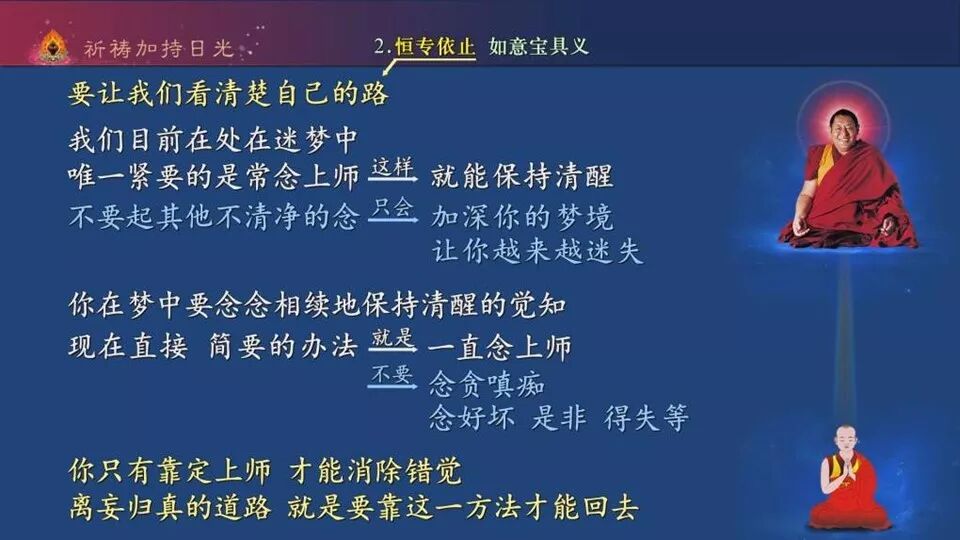 处在梦中要想念念相续地保持清醒的觉知,最直接、简要的办法,就是一直念上师,不念贪嗔痴,不念好坏、是非、得失等。