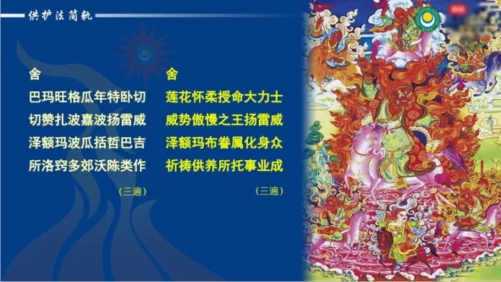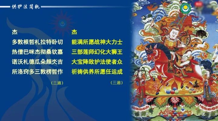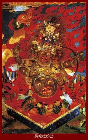“一切加持的赐予者是自己的根本上师,所有悉地的来源则是本尊,各种事业的根本就是空行和护法神,一切一切的根本是守持密乘的戒律。望大家时时刻刻祈祷自己的根本上师,也应修持自己的本尊,念诵本尊的心咒。尤其是承办一切事业,空行母很重要,遣除违缘方面则护法神很重要,所以对空行和护法最好经常供养一些整洁清净的供品,否则只是口头上念诵祈祷,就起不到什么作用。对一切的根本---密乘的戒律也必须要守持清净,这样护法神也会如影随形般经常跟随保护自己。” --- 法王《窍决宝藏海》嗡 桑巴Ra 桑巴Ra 波玛纳萨Ra 玛哈臧巴巴 吽啪的所哈。是莲花生大士幻化的化身大王,能显现种种神通,一生戎马,扬善抑恶,弘扬佛法,降服了佛教之大敌魔及霍尔等。藏传佛教认为该神为造福雪域臣民,广开各种财富之伏藏,以战神之王姿态住世,为供奉者赐予财运,护持家业。格萨尔王头戴战盔,盔缨呈幢形,缨顶插两面小旗。身穿铠甲,面相英武,腰系箭袋,左手执长矛,矛缨彩旗飘扬,右手中战鞭高扬,侧身跨战马,站立在莲座上。在格萨尔绘像上方有众神放出的各种动物。妃子珠牡和梅萨胁伺左右。藏名阿松妈,意即密咒护持母,梵名艾嘎乍纪,汉译独发母或一发母,乃宁玛巴之主要三不共智慧护法之一,司护持出世间法之一切成就。一髻佛母,一面二臂,身青黑色或褐红色,独目居于额头中央,独齿尖锐有如普巴杵,牙尖向下,一发撑天,头戴五骷冠,独乳居胸正中,右手高举人尸,左手执魔心与豺狼,身披人皮衣,下着虎皮裙,项挂五十鲜血人首,隆乳蜂腰圆腹,足以右曲左伸姿,成立于日莲尸座上。一髻佛母乃普贤王佛母所示现之大护法,故其形之特点皆表法身一体。此一发、一目、一齿、一乳等,并非为单一之一,而是整体之一,盖表充遍法界之整体也。一髻佛母属智慧护法,护持行人世间之成就,是求福德之修法。又名毗纽天、摧敌大遍入护法。遍入者是为能够自在摄入五大---地、水、火、风、空也,亦是宁玛巴三大不共护法之一,司护持降伏法成就。此尊住怖畏尸陀林恶园,血脂波涛之内。罗候魔曜,身烟灰色,有九首,顶有老鸦首。九首皆载五骷髅冠,披人皮,下着虎皮裙,项挂鲜血人首,以蛇饰骨饰为身庄严。四臂主二手持弓箭作射状,右次手执摩羯海怪幢,左次手执蛇绳,全身皆眼,身以下乃龙形,作蜿蜒状。眷属有四位东嫫、罗侯廿八星宿、豺狼、黑狗、八部傲慢魔军。又名金刚善护法,藏名单金多杰列巴,意即具誓金刚善,于莲花生大士入藏时,奉金刚手菩萨口敕,化身为铁匠,密护佛法,驻守贡噶雪山,为莲师之事业护法,护持世间法成就,是宁玛派三不共护法之一。此尊所显现的不一,骑狮子者较为寂静,骑山羊者则较忿怒。多杰列巴一面二臂三目,黄发卷曲,头戴藏铠兵帽,三目赤红圆睁,须眉如火炽,露牙卷舌相。右手高举天铁金刚杵扬于虚空,左手执魔心作噉食状,身穿藏袍大褂,足蹬藏鞋,跨坐于雪山青毛白狮之上,安住于般若智焰中央。此尊威力极大,无敌不摧,可破邪魔外道符咒,降魔于瞬刻之间。又名夜叉紫玛热、妖红怪子,为藏地最凶猛的赞与魔相配后所生之子。原为西藏原始苯教之护法神,猛力夜叉军之首领,在莲师到达西藏后将其降伏,坚守护卫佛陀教法之誓言,听从莲花生大士的调遣,保护莲师宁玛巴传承的教法事业及其弟子,为宁玛巴不共的大力智慧护法。身为三界众生司命主的紫玛热护法,既是夜叉财神,亦兼冥界判官,更是大悲怙主观自在菩萨的化身,大力马头明王的慈悲之化现,外显极忿怒相,内怀彻骨大悲!身为夜叉军之首领的紫玛护法神,摧魔降伏之力威猛无比,能刹那间围绕三界抛出红索,勾招怨敌之魂魄刺与燃烧之(赞)矛。虔诚供养祈祷紫玛热护法者必将迅速获得此生的财富、权力,增上运气等种种顺缘,来生也会得到种种顺利和殊胜助缘,更可得到出世间的解脱成就。