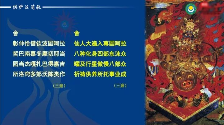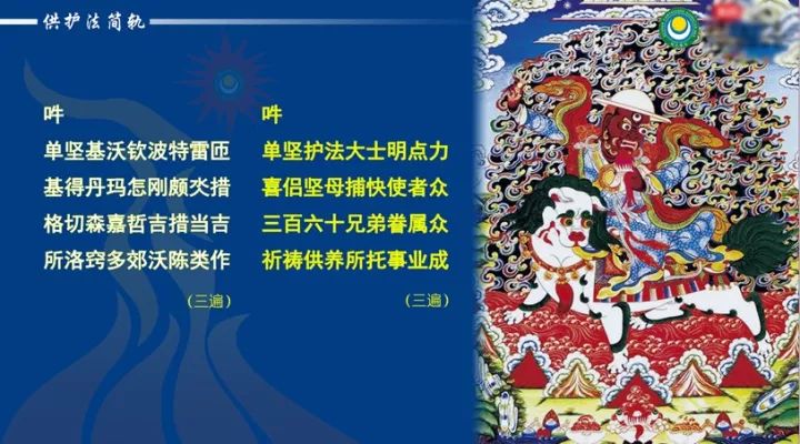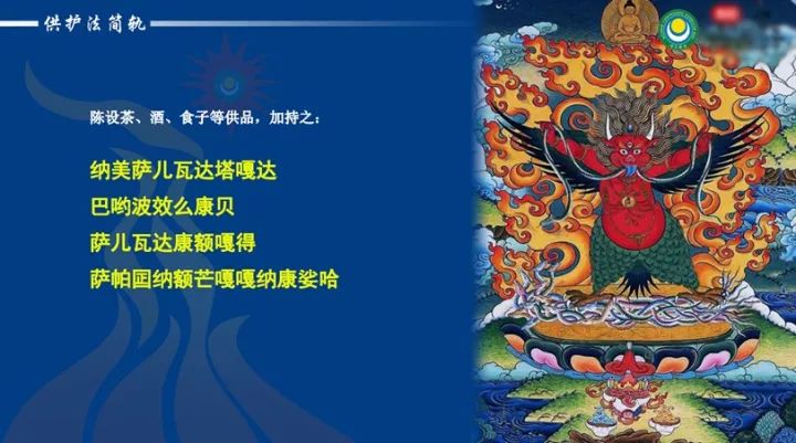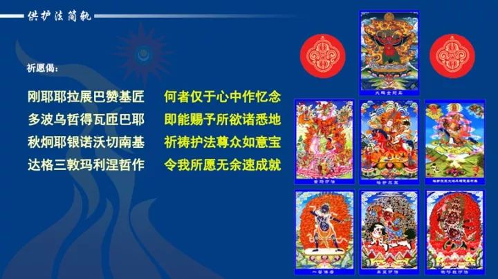 有护法的唐卡、像等最好,没有也可以。如,上师仁波切每天带领僧众在新金刚萨埵殿堂里供护法,但金刚萨埵殿没有挂护法的唐卡和像。旧的金刚萨埵经堂设置了护法像。学院有些小经堂也没有挂护法像。但一般精舍中,都会供护法照片或唐卡。供品方面,供护法的供品放在专门的供护法的杯盏中供,是分开供的。准备一个干净的盘子或类似盘子的器皿,作为盛装糖果、饼干、糕点等殊妙供品的器具。再准备一个盛装酒,或者茶水、饮料等的护法杯(如果供酒不方便,茶水、饮料等也可以)。在念诵前将盘中与杯中的供物都盛放好,在此基础之上,念诵时念到每一尊护法神时,还要边念边往护法杯中倒酒或荼水等供物,几尊护法神的供物可供于同一供具中。在回向之后,将供物安置于他人践踏不到的较清净处,比如屋顶等处。安置完供物之后,要用清水将盛放供物的器具洗净,再用净布擦干。在念诵正式的供养仪轨前,最好先念修《金刚七句祈祷文》、皈依发心仪轨。如果稍广一点的话,可以先念修加持咒、圣八吉祥颂、供养仪轨、皈依发心仪轨、怀业自在祈祷文、金刚七句祈祷文后正式念修供养。