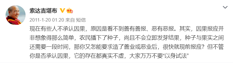 现在有些人不承认因果,原因是看不到善有善报、恶有恶报。其实,因果报应并非想象得那么简单,农民播下了种子,尚且不会立即发芽结果,种子与果实之间还需要一段时间,那你又怎能要求造了善业或恶业后,很快就现前报应?但不管你是否承认因果,它的存在都真实不虚,大家万万不要“以身试法”